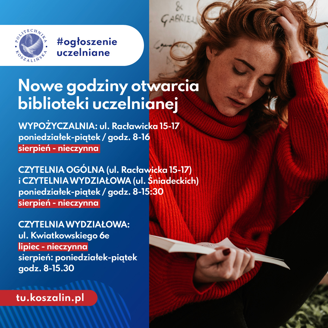 W lipcu i sierpniu br. Biblioteka Politechniki Koszalińskiej, jak zawsze w przerwie wakacyjnej, ma zmienione godziny otwarcia.