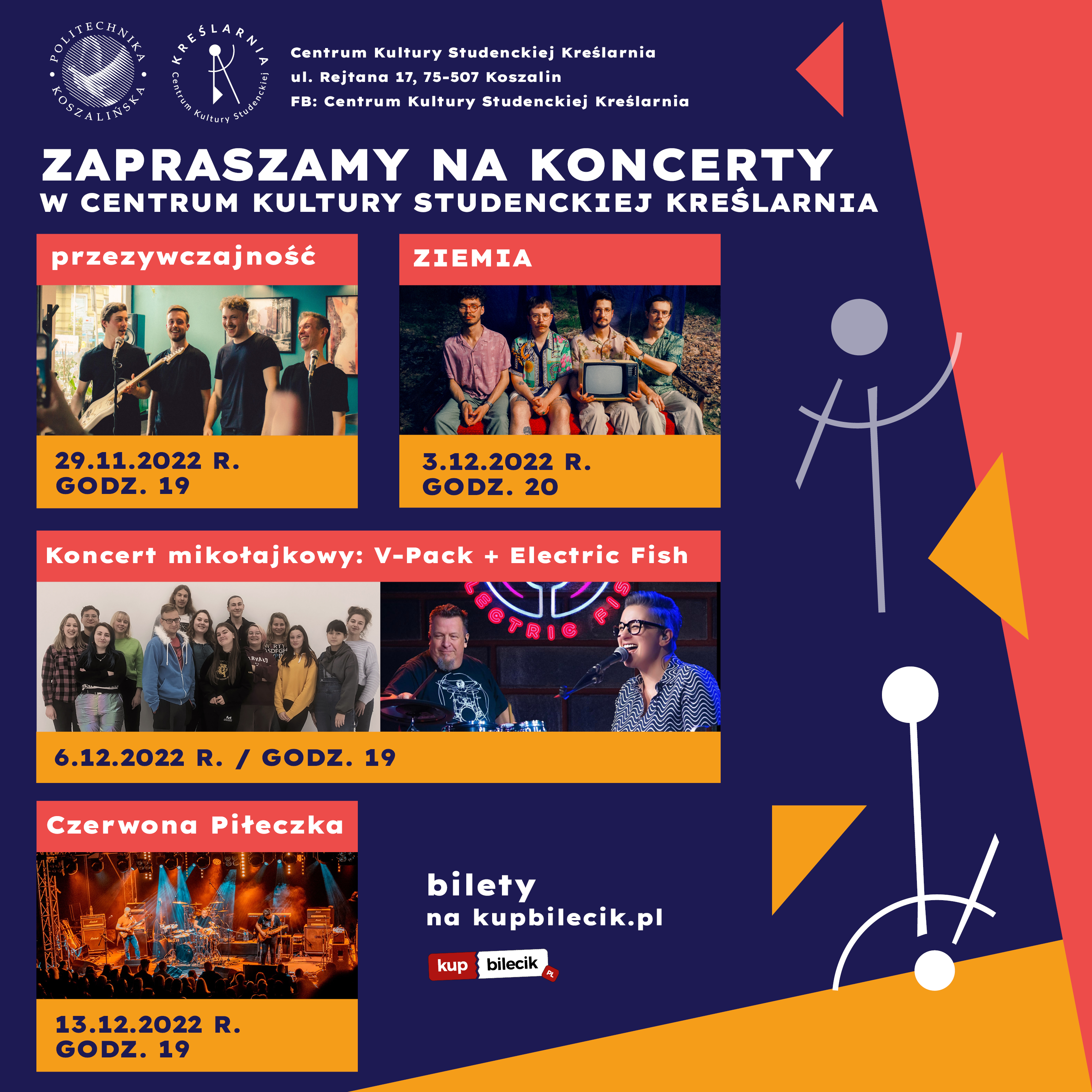 Bilety na koncerty dostępne są na platformie kupbilecik.pl. Dla studentek i studentów Kreślarnia przewidziała pulę darmowych wejściówek. Aby je zdobyć, należy śledzić profil FB klubu.