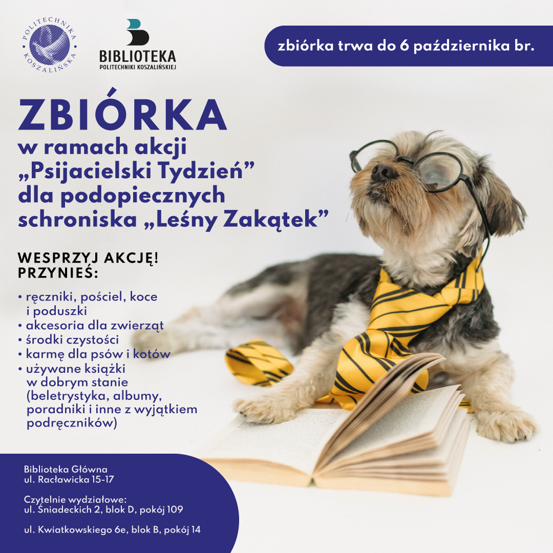 Politechnika Koszalińska kolejny raz jest partnerem akcji „ Psijacielski Tydzień” organizowanej przez Galerię Emka. Okazją do tego wyjątkowego tygodnia jest dzień 4 października – od lat uważany za Światowy Dzień Zwierząt. Akcją w imieniu Politechniki Koszalińskiej tradycyjnie pokieruje Biblioteka Uczelniana. Pracownicy uczelni, którzy chcą wesprzeć akcję i dołączyć do „Psijaciół” schroniska, mogą wesprzeć akcję na dwa sposoby. Można zostawić w oddziałach Biblioteki PK karmę, koce czy zabawki dla psów i kotów ze schroniska lub przekazać używane książki (beletrystykę, albumy, poradniki itp.). Zbiórka potrwa do 06.10.2023 r.