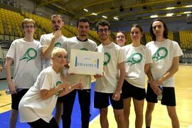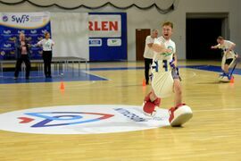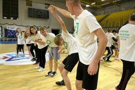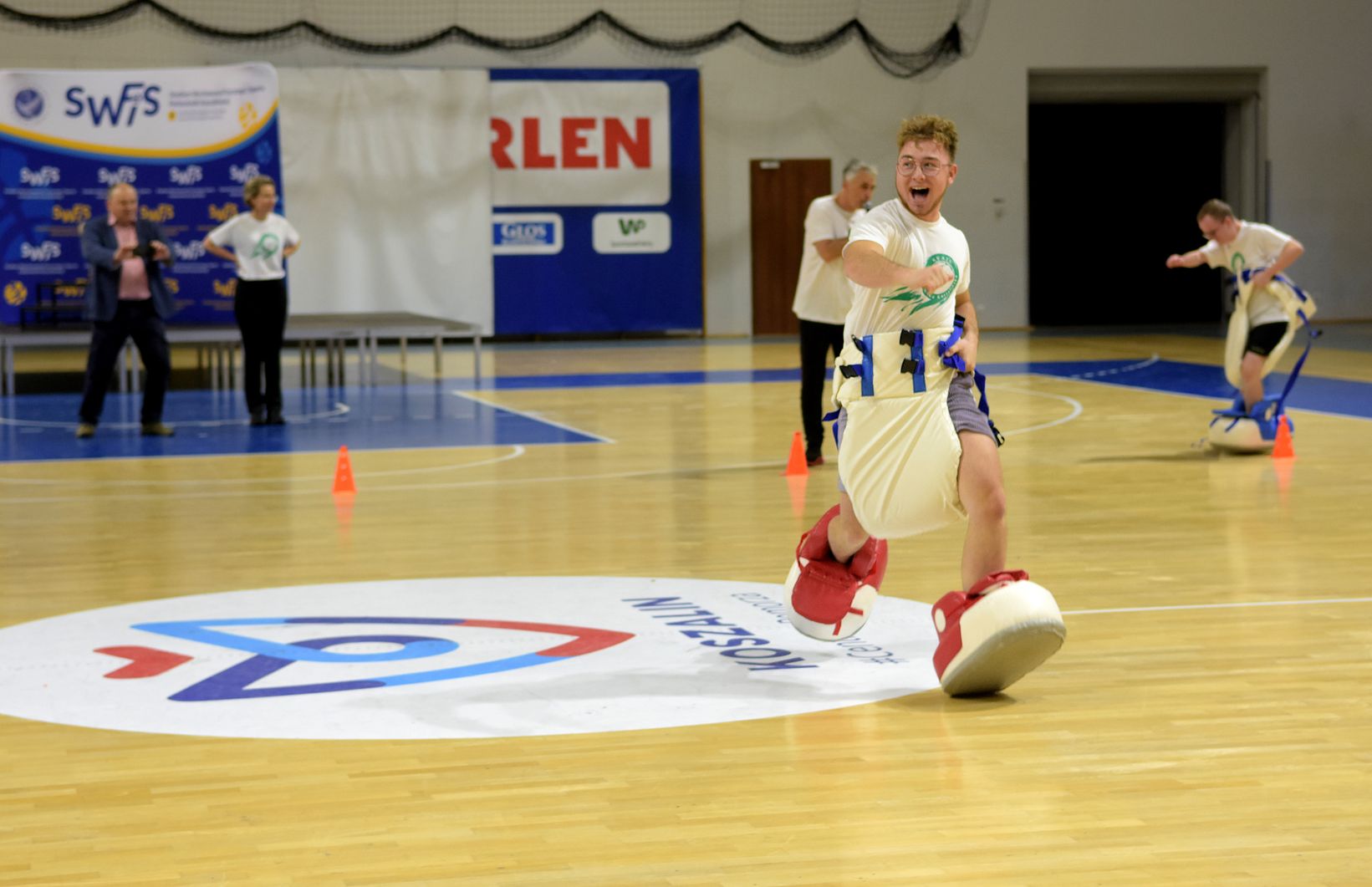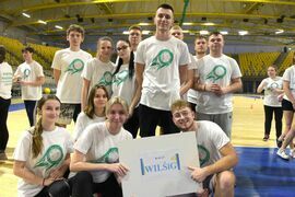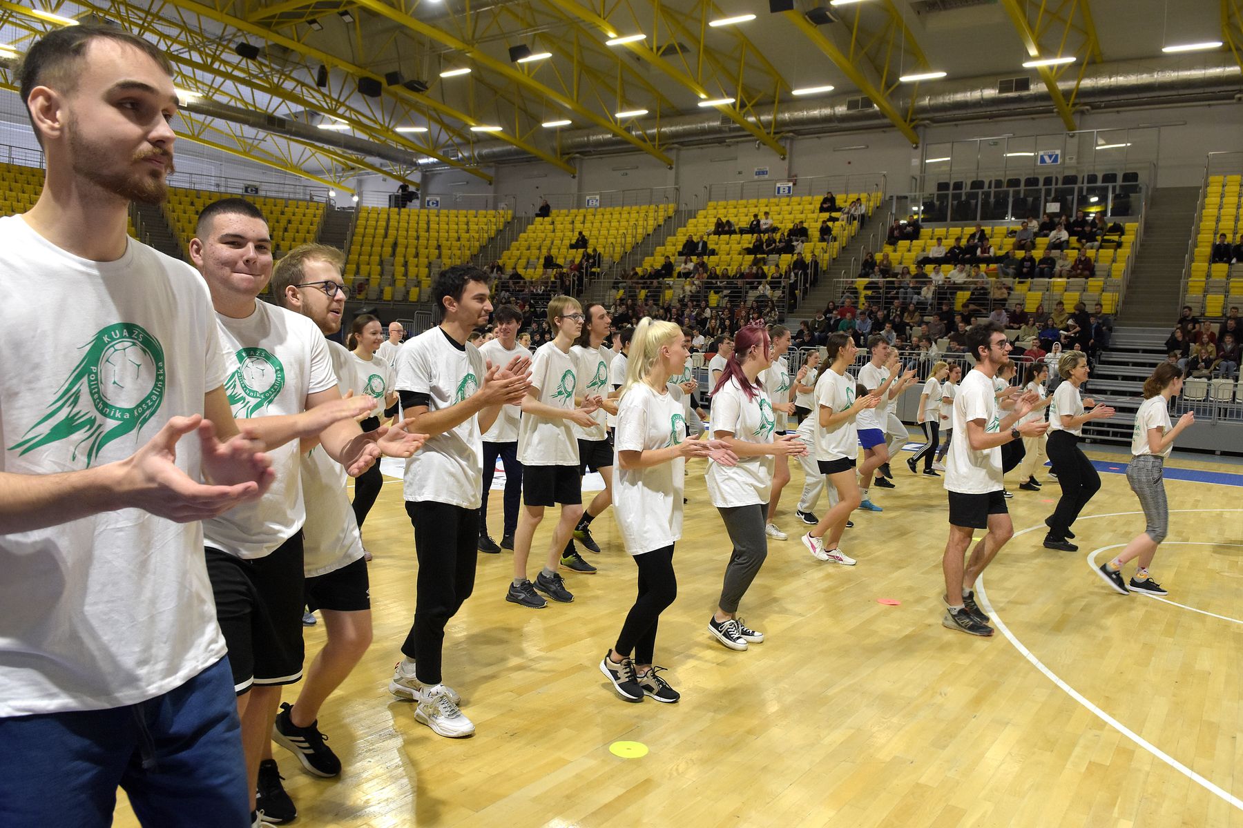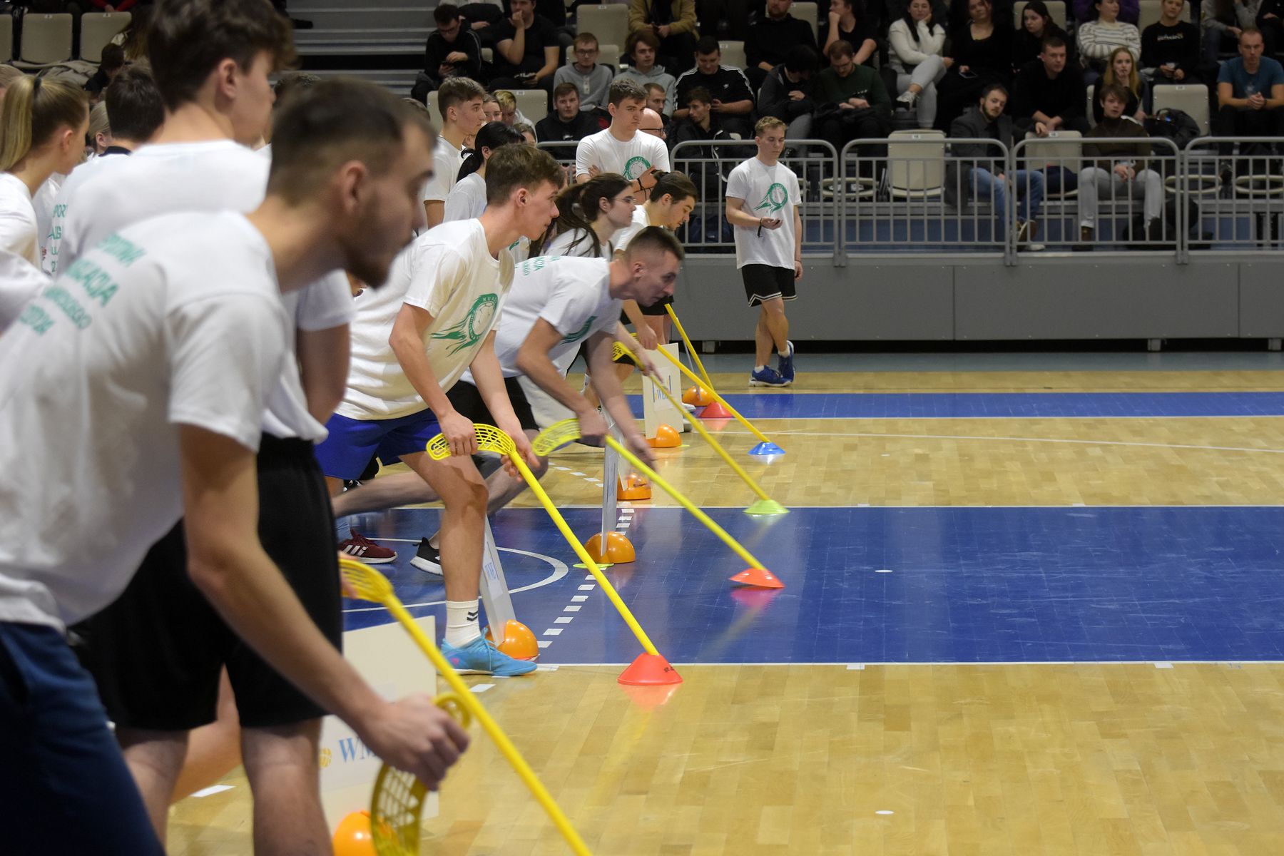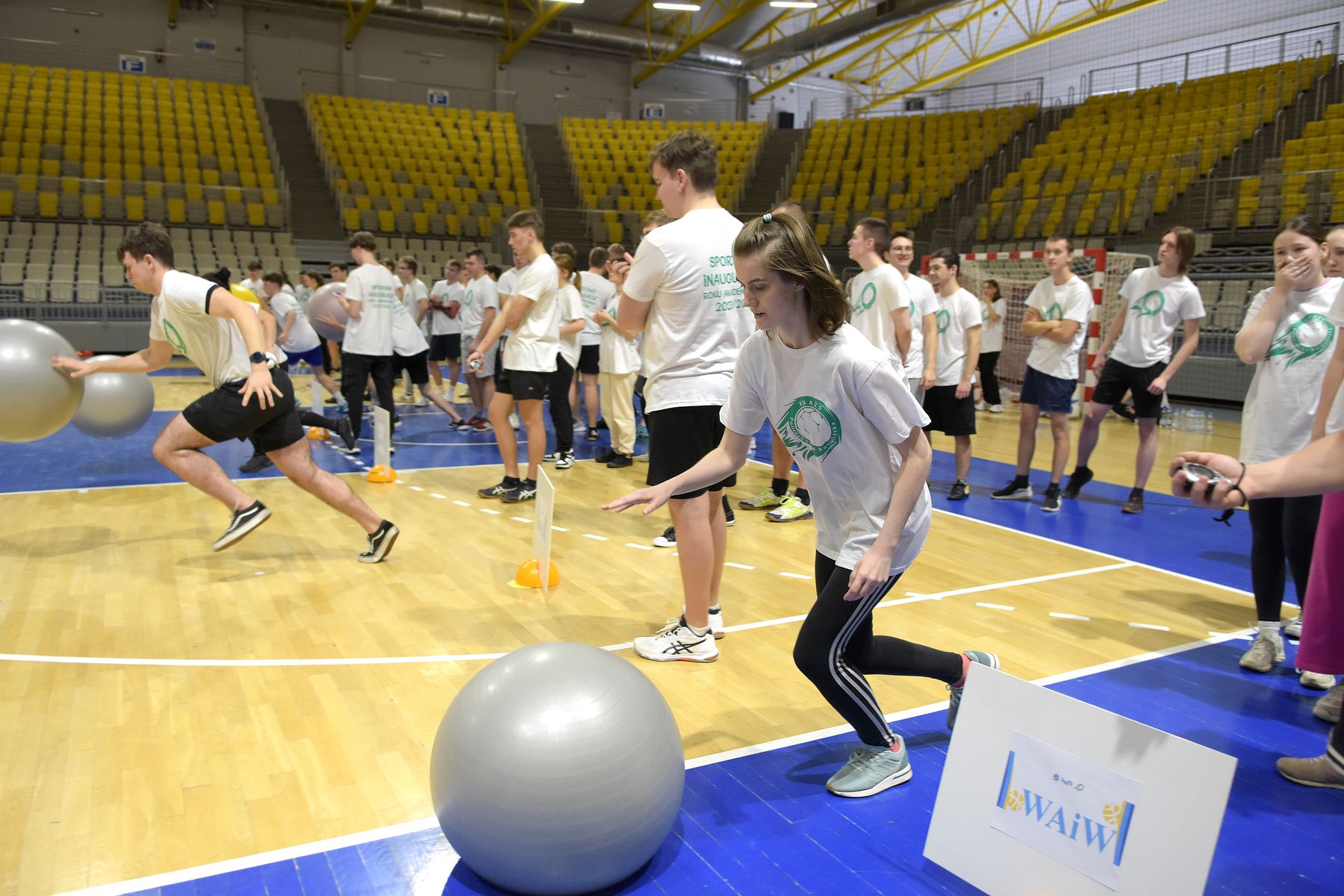 Po wspólnej rozgrzewce przyszedł czas na zmagania. Uczestnicy zmierzyli się w kilku konkurencjach. Musieli wykazać się sprytem, szybkością i współpracą. Czekał na nich: bieg pierwszoroczniaka w pielusze sumo i ogromnych butach, kozłowanie dużą piłką, hokejowy slalom czy zręcznościowe przekładanie hula hop. Koleżanki i koledzy z wydziałów, którzy zasiedli na trybunach, kibicowali rywalizującym na parkiecie ekipom. W zawodach wystartowała także drużyna składająca się ze studentów przebywających na wymianie międzynarodowej w ramach programu Erasmus+.