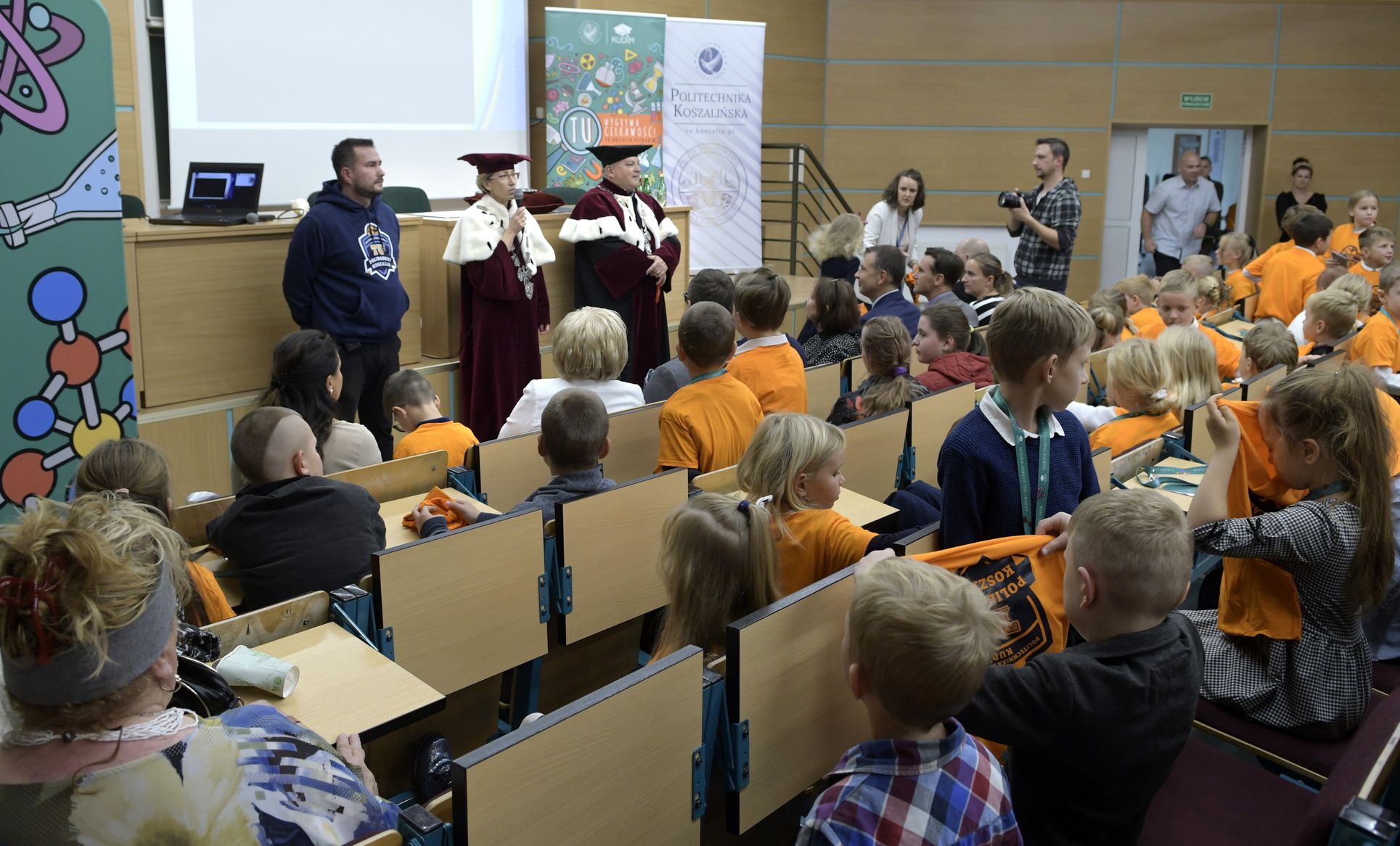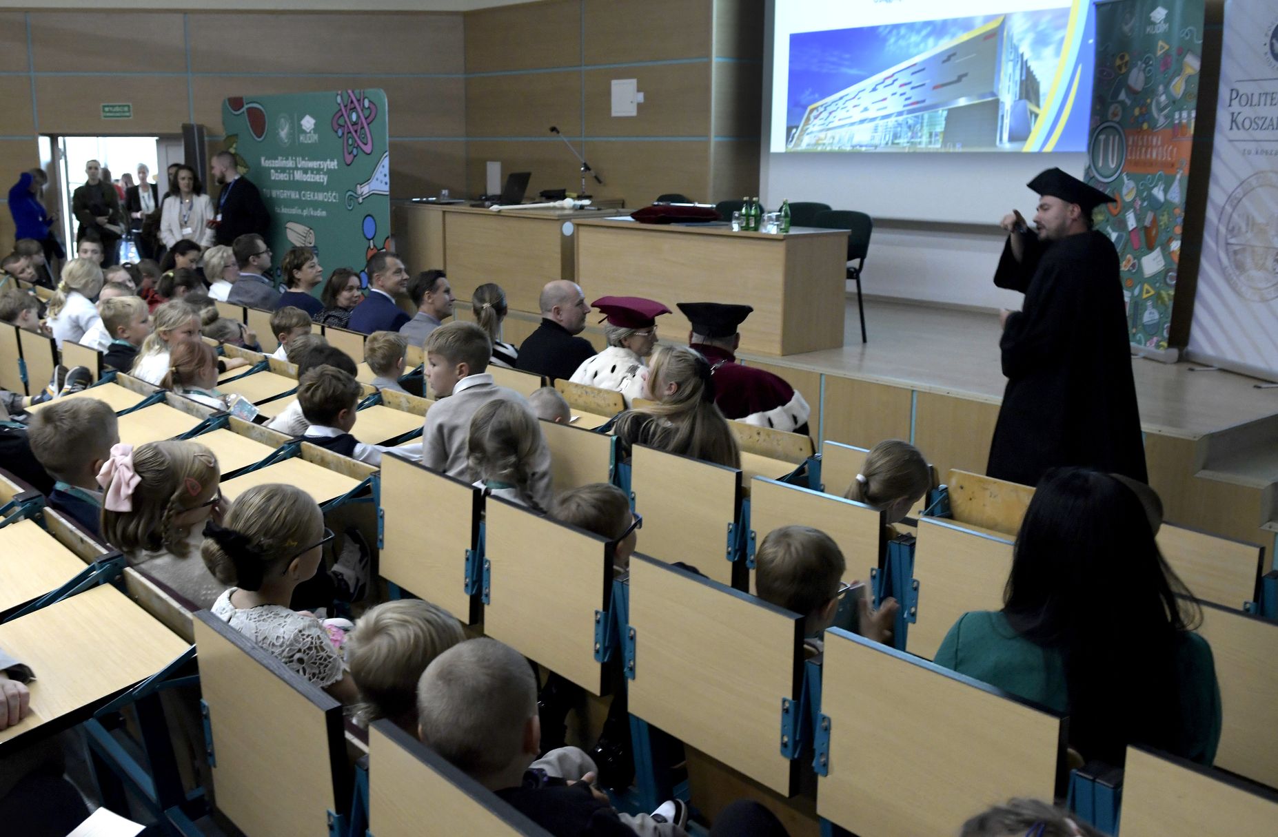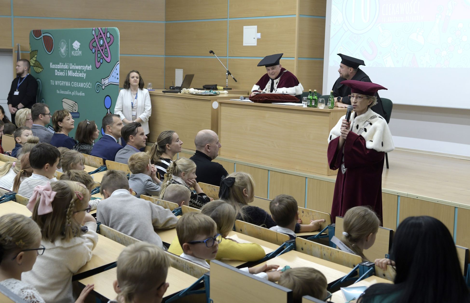 W sobotę, 4 października odbyła się inauguracja Koszalińskiego Uniwersytetu Dzieci i Młodzieży Politechniki Koszalińskiej. Dzieci w auli kampusu przy ulicy Śniadeckich przywitała dr hab. Danuta Zawadzka, prof. PK, rektor Politechniki Koszalińskiej i dr hab. inż. Tomasz Królikowski, prof. PK, prorektor ds. studenckich. Młodzież w społeczność akademicką wprowadził także dr hab. Grzegorz Przekota, prof. PK, dziekan Wydziału Nauk Ekonomicznych. Wykład na temat sportowych talentów i możliwości jakie drzemią w młodym pokoleniu przedstawił trener reprezentacji Politechniki Koszalińskiej w koszykówce, mgr Michał Sugier, podczas którego ogłosił powołanie nowego klubu koszykarskiego Politechniki Koszalińskiej TU Polibasket. Uroczystość uświetnił występ Dziecięcej Akademii Chóralnej Pomerania Cantat w Koszalinie. Chór po immatrykulacji odśpiewał hymn studencki, Gaudeamus igitur. Głównym celem Uniwersytetu jest inspirowanie młodych umysłów do odkrywania świata i rozwijania pasji w różnych dziedzinach – od nauk ścisłych, przez technikę i przyrodę, aż po sztukę i sport. Uczelnia prowadzi zajęcia w dwóch grupach wiekowych: w grupie dziecięcej (klasa I-V) i młodzieżowej (klasa VI-VIII). W roku akademickim 2025/2026 w zajęciach KUDiM-u bierze udział około 250 dzieci w wieku od 6 do 15 lat. Młodzi studenci uczestniczą w wykładach z różnych dziedzin – od biologii i chemii, przez fizykę i mechanikę. Są spotkania z ciekawymi ludźmi, warsztaty i zajęcia w laboratoriach. Od 2016 roku, dzięki wsparciu firmy Kronospan, oddział Koszalińskiego Uniwersytetu Dzieci i Młodzieży Politechniki Koszalińskiej funkcjonuje także w Szczecinku.