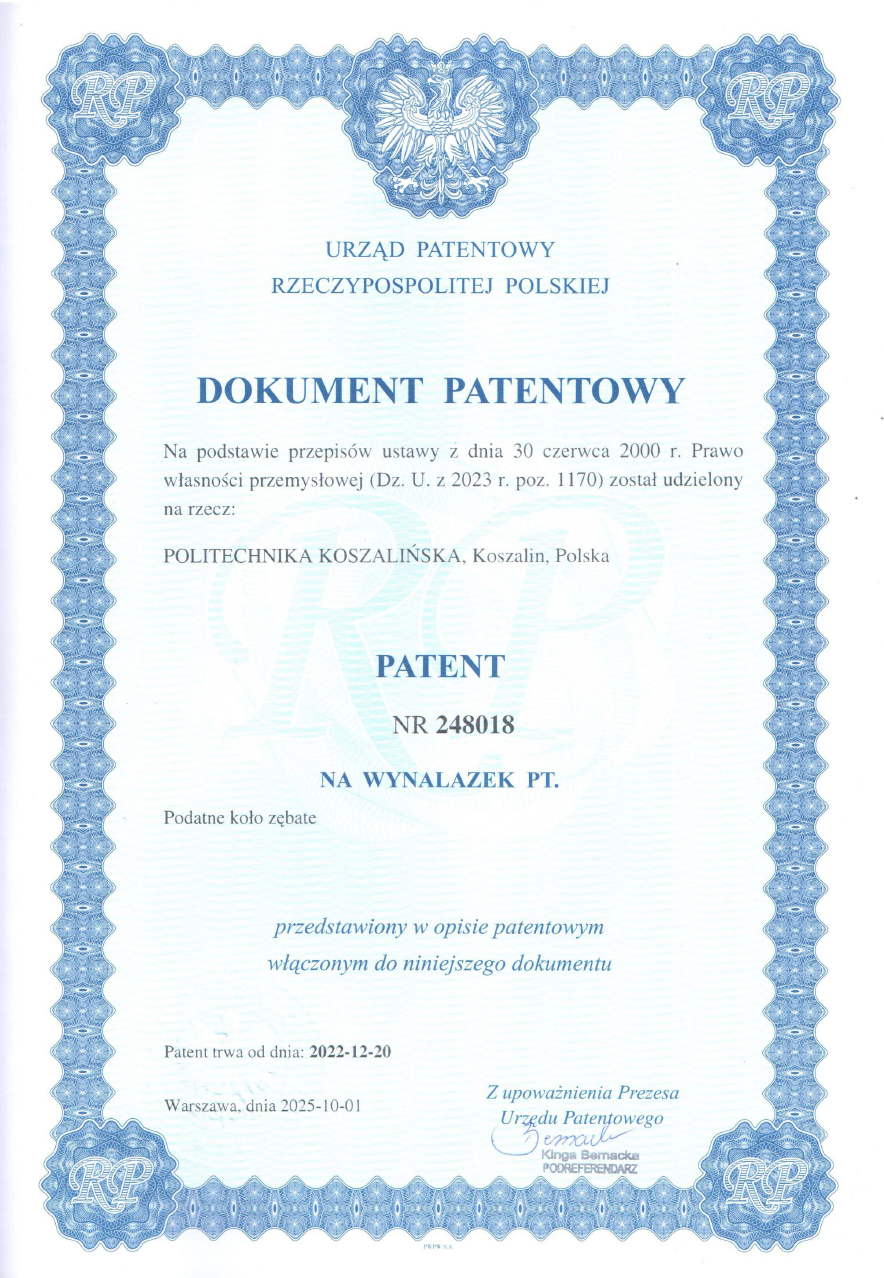 Zespół naukowców z Politechniki Koszalińskiej w składzie: prof. dr hab. inż. Wojciech Kacalak; dr hab. inż. Zbigniew Budniak, prof. PK; dr hab. inż. Dariusz Lipiński, prof PK; dr hab. inż. Błażej Bałasz, prof. PK; dr inż. Łukasz Rypina, dr inż. Monika Szada-Borzyszkowska, otrzymał patent na wynalazek o nazwie: Podatne koło zębate.