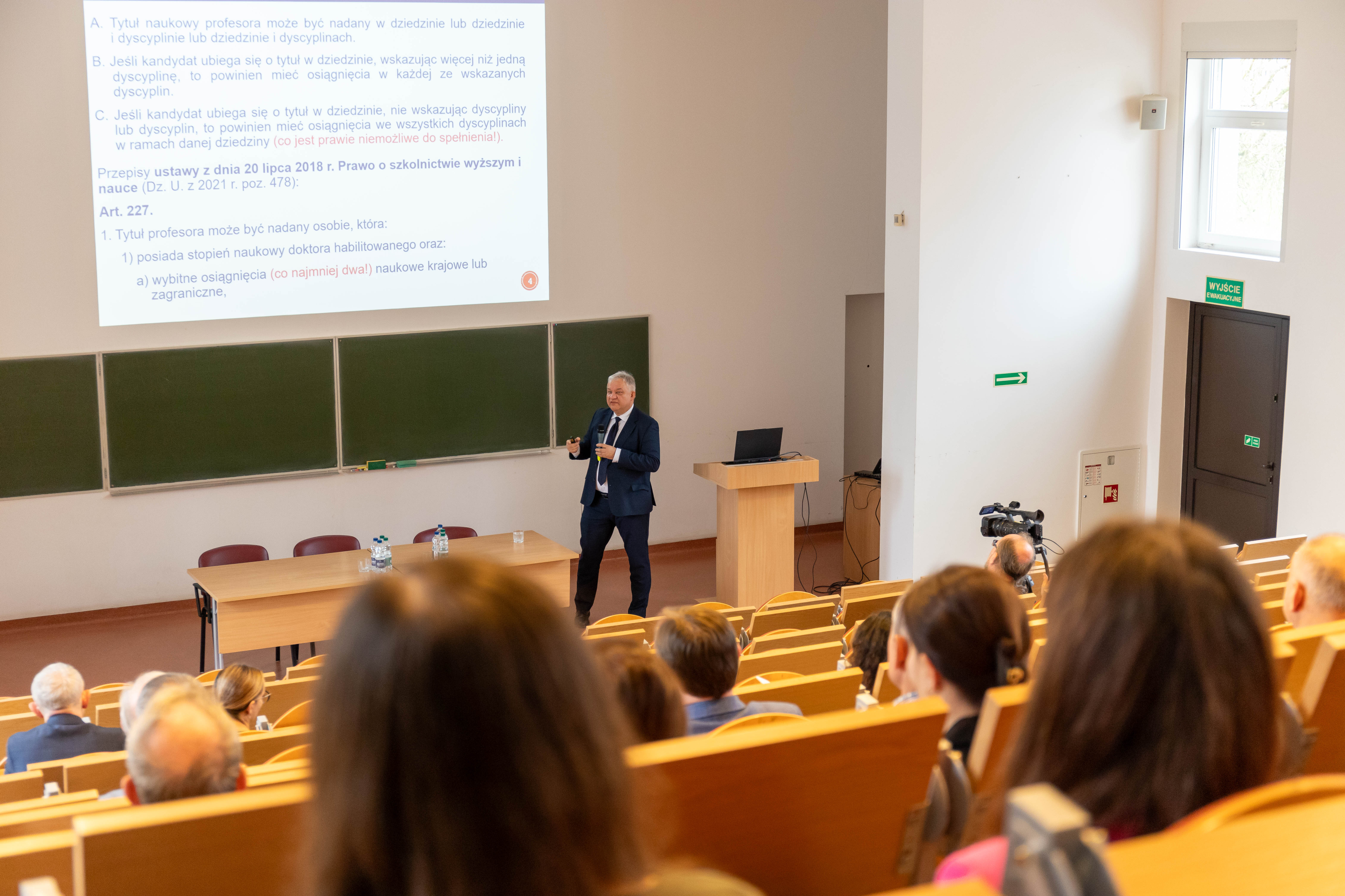 Członek Rady Doskonałości Naukowej w Zespole Nauk Inżynieryjno-Technicznych w zakresie dyscypliny naukowej Inżynieria Mechaniczna, na podstawie ustawy "Prawo o szkolnictwie wyższym i nauce" tłumaczył kryteria nadania tytułu. Wyjaśnił też jakie są wymagania, wyjątkowe przypadki, osiągnięcia wybitne, opinie i uzasadnienia w drodze do zdobycia np. profesury czy stopnia doktora hablitowanego. Profesor Andrzej Seweryn przybliżył czym zajmuje się Rada Doskonałości Naukowej. Przeszedł także przez ścieżkę od złożenia wniosku do RDN przez wgląd do dorobku naukowego, przez opłaty, oceny, aż do finalnej decyzji Prezydenta RP.