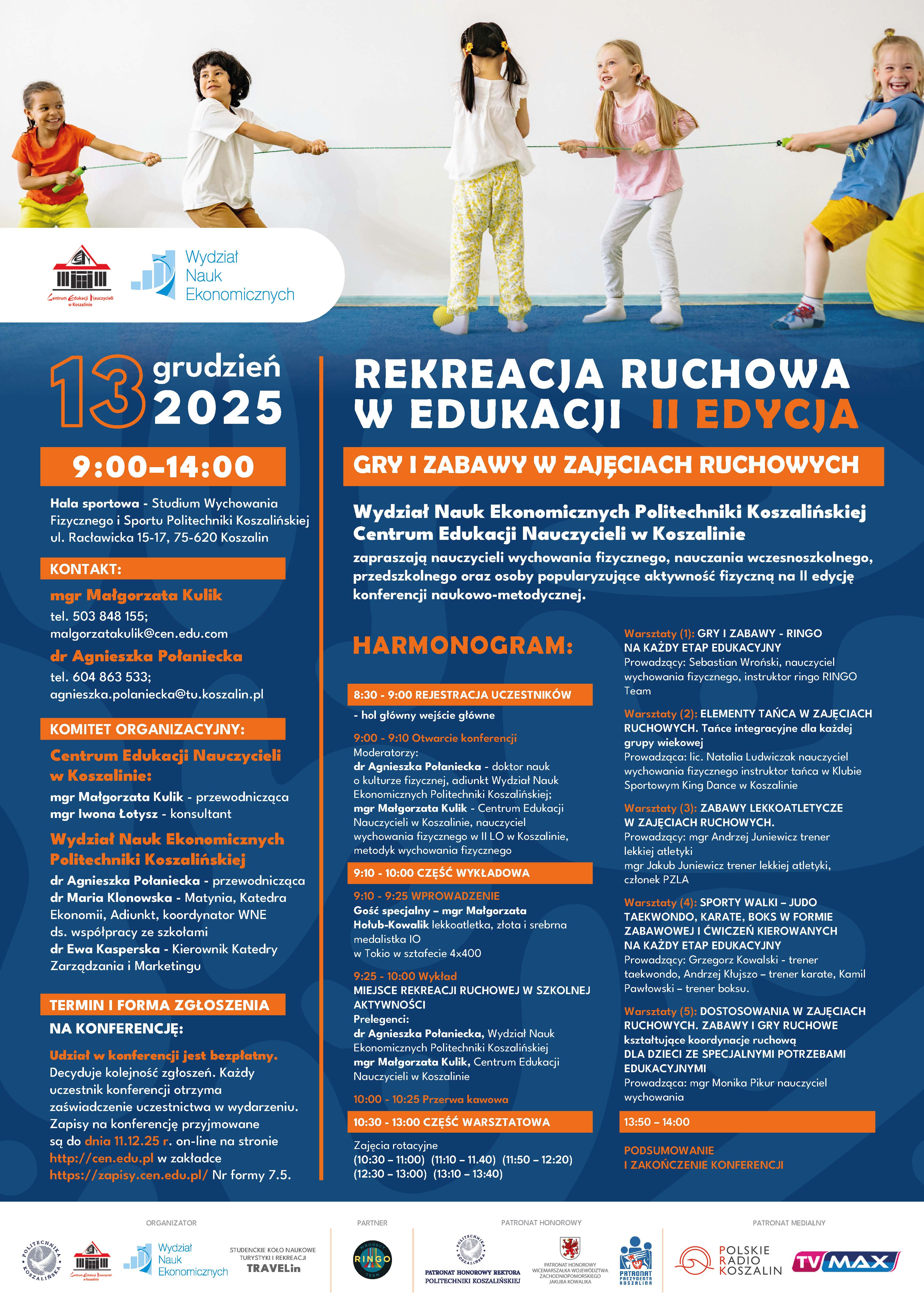 Zapraszają nauczycieli wychowania fizycznego, nauczania wczesnoszkolnego, przedszkolnego oraz osoby popularyzujące aktywność fizyczną na II edycję konferencji naukowo-metodycznej nt. REKREACJA RUCHOWA W EDUKACJI. GRY I ZABAWY W ZAJĘCIACH RUCHOWYCH