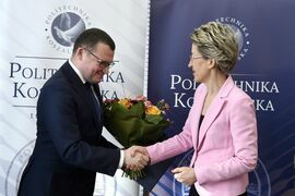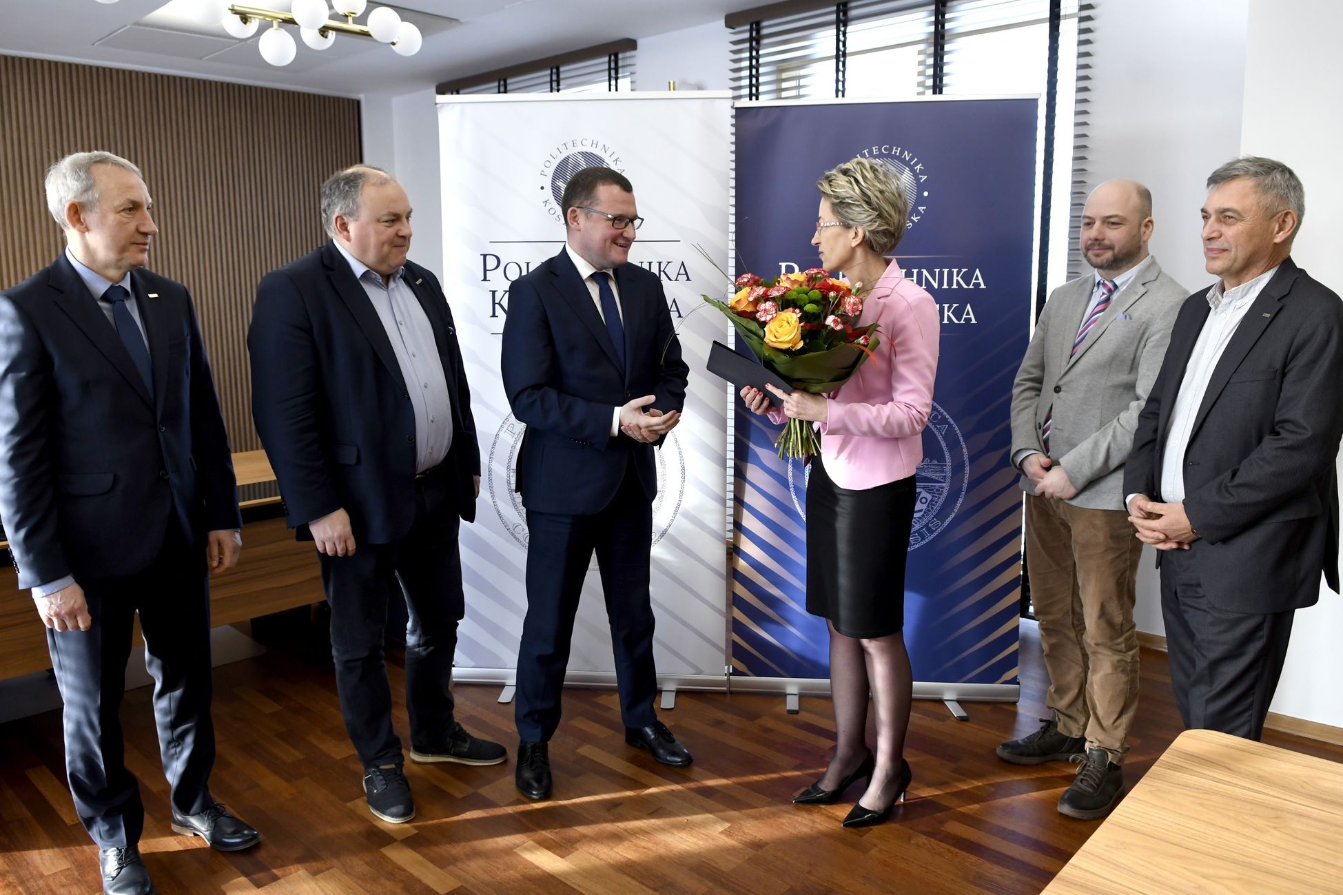 Z politykiem spotkała się rektor dr hab. Danutą Zawadzką, prof. PK. W rozmowach uczestniczyli również prorektorzy: dr hab. inż. Błażej Bałasz, prof. PK, dr hab. inż. Tomasz Królikowski, prof. PK i dr hab. Krzysztof Wasilewski, prof. PK oraz kanclerz uczelni Adam Gawrysiak. Prof. Danuta Zawadzka przekazała gościowi gratulacje z okazji objęcia funkcji w Pałacu Prezydenckim.