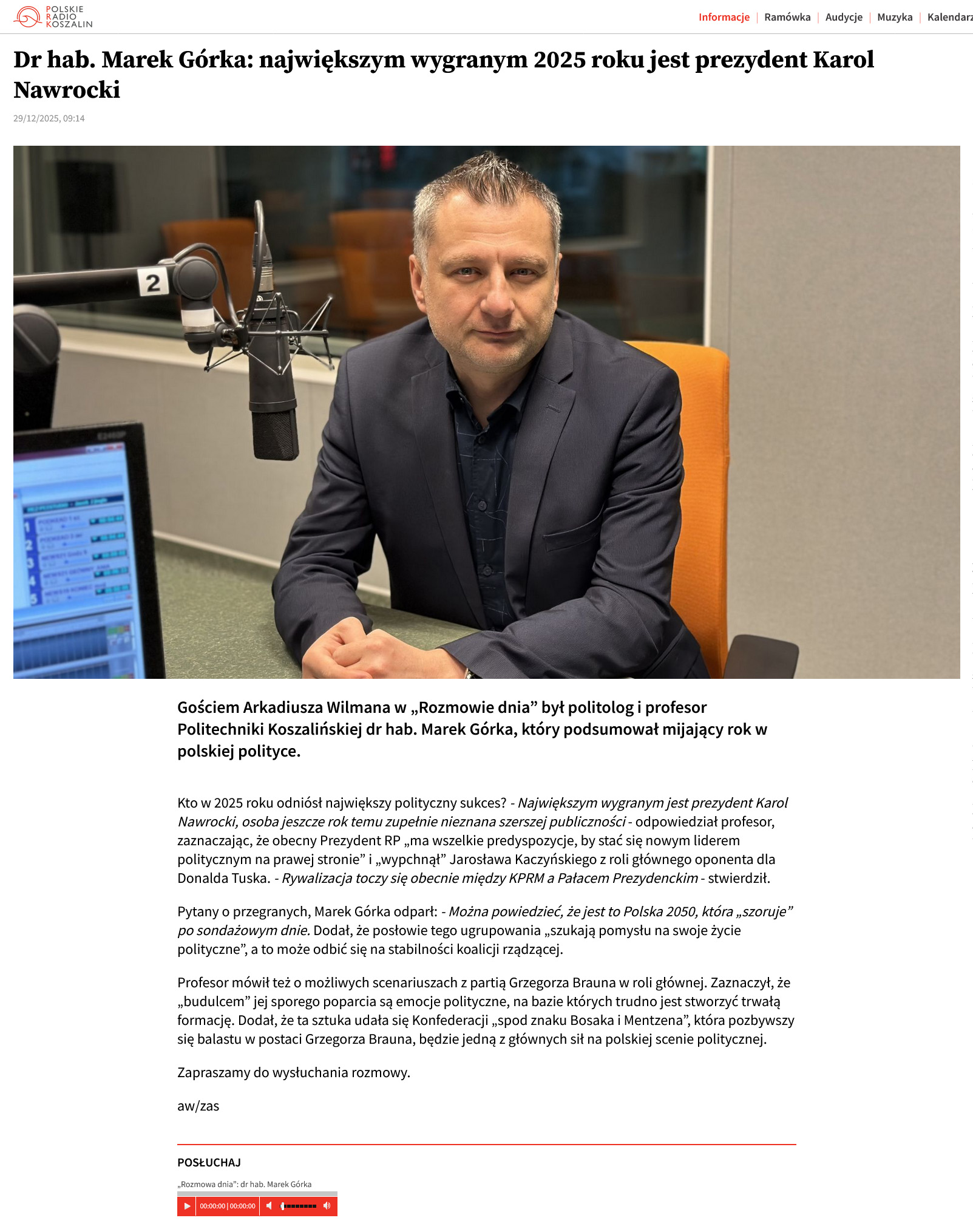 Dr hab. Marek Górka: największym wygranym 2025 roku jest prezydent Karol Nawrocki