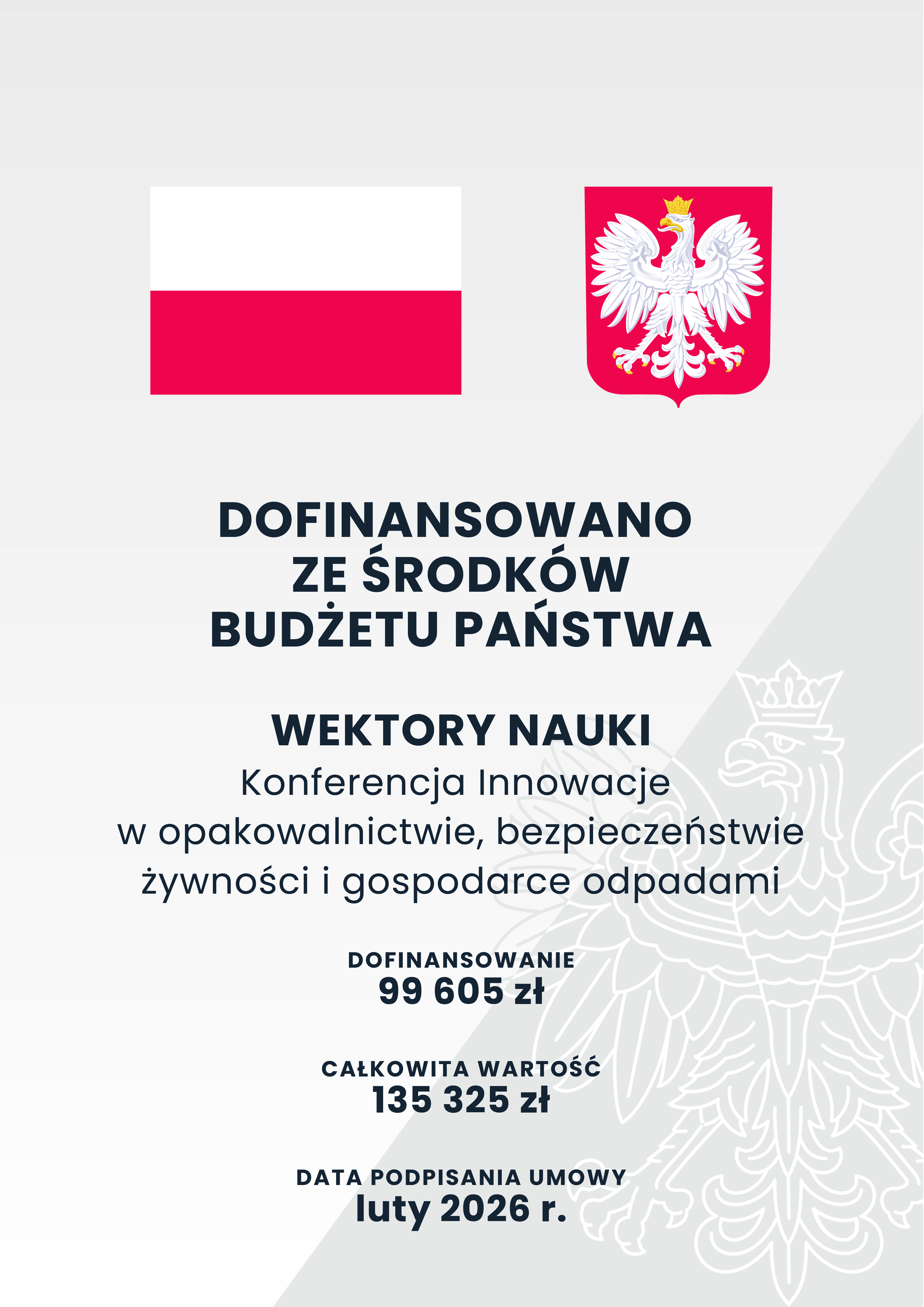 Projekt pn. Konferencja ,,Innowacje w opakowalnictwie, bezpieczeństwie żywności i gospodarce odpadami" o charakterze międzynarodowym, będzie wydarzeniem służącym prezentacji najnowszych trendów i wyzwań w opakowalnictwie, głównie w branży spożywczej, ale także w innych jego sektorach. Jej wyjątkowość polega na połączeniu środowiska naukowego i przemysłowego: specjalistów z obszarów technologii żywności, żywienia człowieka, przetwórstwa, recyklingu tworzyw sztucznych i odpadów polimerowych oraz gospodarki odpadami, a także dostawców innowacyjnych technologii.