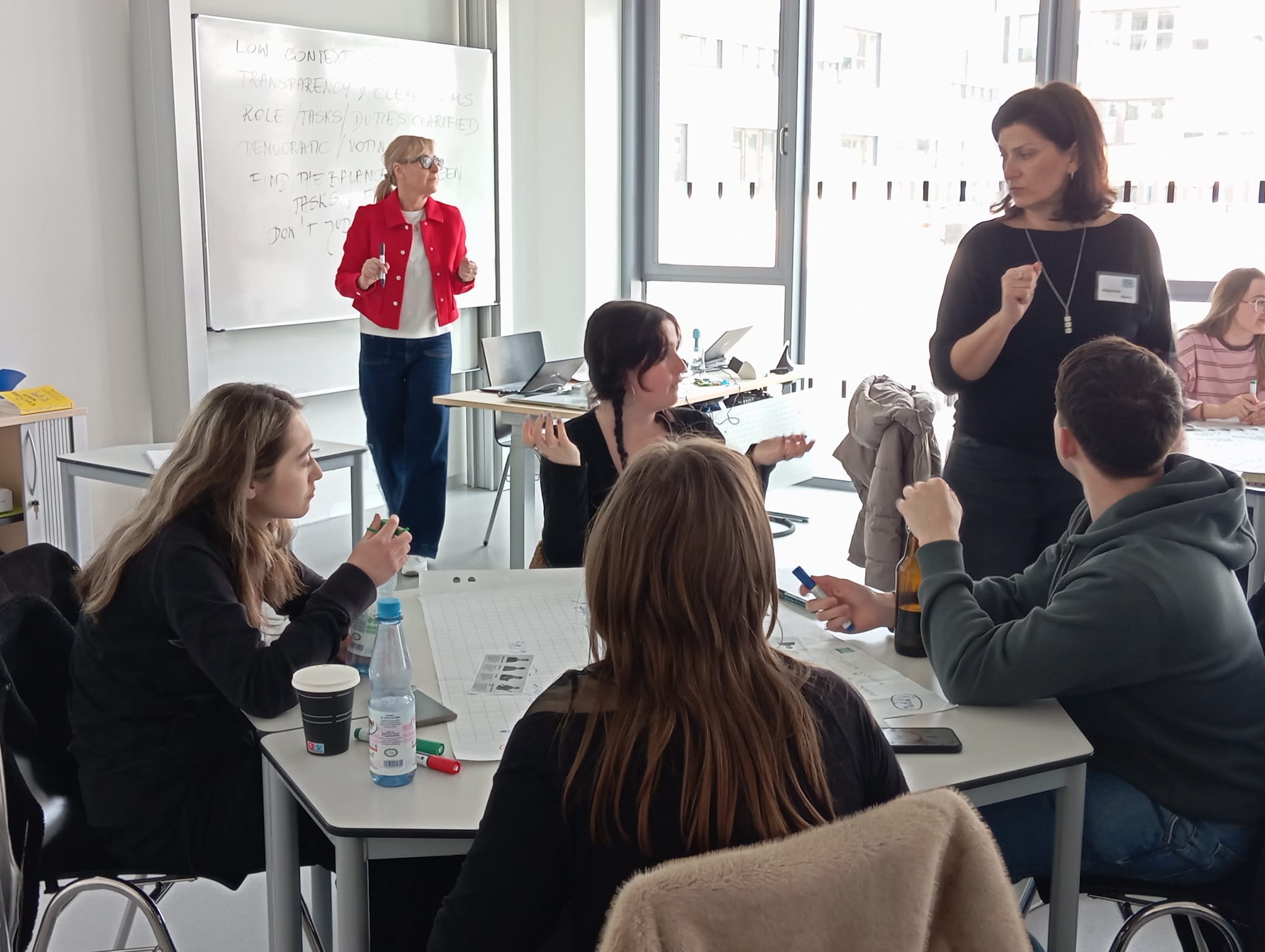 Zajęcia prowadzone są w formule warsztatowej. Wczoraj, (25 marca br.) mgr Małgorzata Merkis i mgr Joanna Stankiewicz-Majkowska poprowadziły blok zajęć Multicultural Communication – Case Studies. Równolegle mgr Marzena Hus uczestniczyła w spotkaniach roboczych wspólnie z Juttą Helmus w LehrLernZentrum RheinMain UAS oraz z kierowniczką centrum Louise Klein, co dodatkowo wzmacnia współpracę instytucjonalną i wymianę praktyk dydaktycznych.