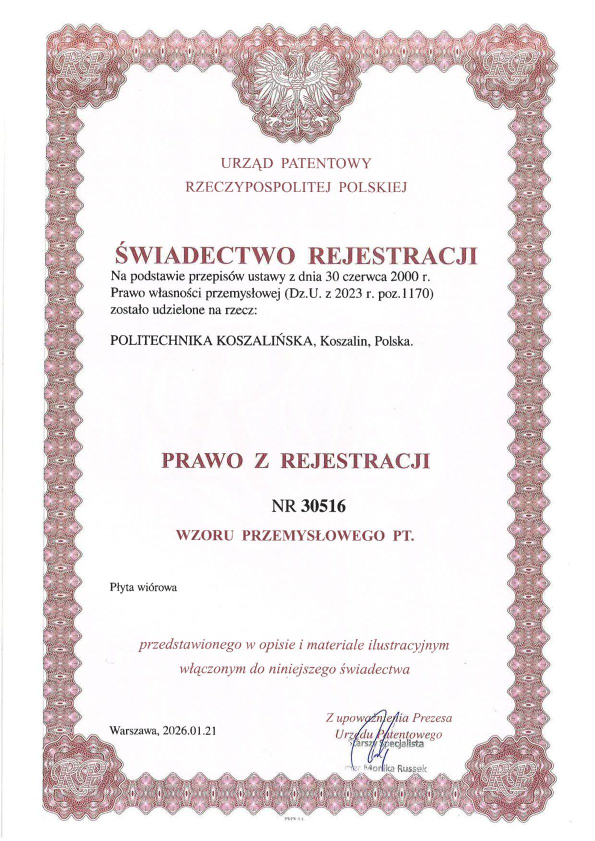 Zespół badaczy z Filii Politechniki Koszalińskiej w Szczecinku oraz Wydziału Inżynierii Mechanicznej i Energetyki Politechniki Koszalińskiej – dr hab. inż. Tomasz Rydzkowski, prof. PK, dr inż. Wiesław Szada-Borzyszkowski, dr inż. Grzegorz Chomka, dr inż. Jarosław Chodór oraz dr inż. Monika Szada-Borzyszkowska – opracował nowatorską koncepcję płyty wiórowej łączącej funkcję konstrukcyjną z atrakcyjnym efektem wizualnym.