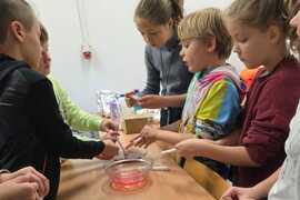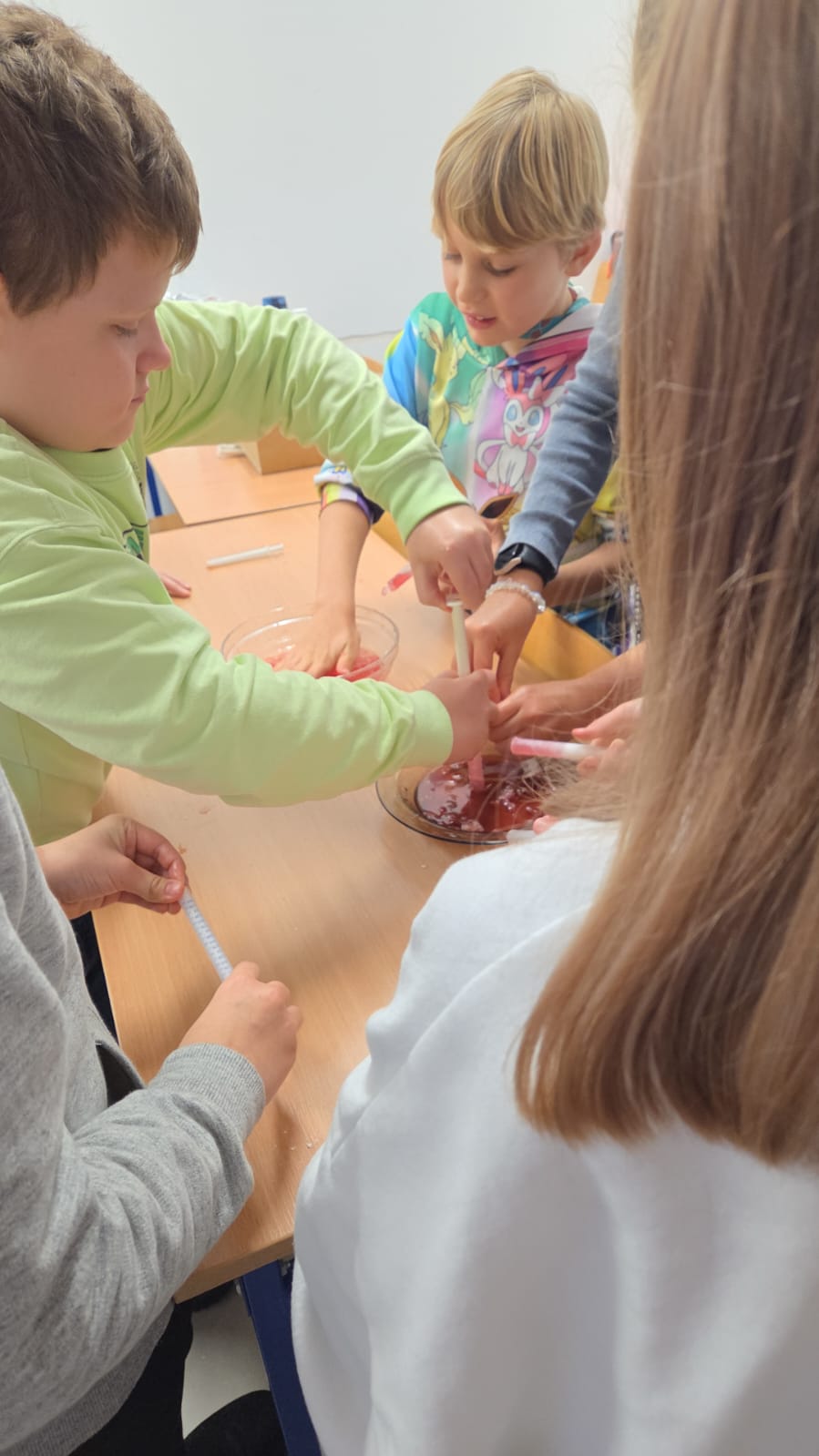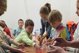 Nie zabrakło również warsztatów chemicznych z tworzenia kul do kąpieli. Młodzi studenci tworzyli własnoręcznie ekologiczne kule, które mogli zabrać ze sobą do domu i wypróbować podczas wieczornej kąpieli. Prowadząca warsztaty to dr Magdalena Szelągowska, która przygotowała dla uczestników niespodziankę - tworzenie "robaków" w wodzie.
