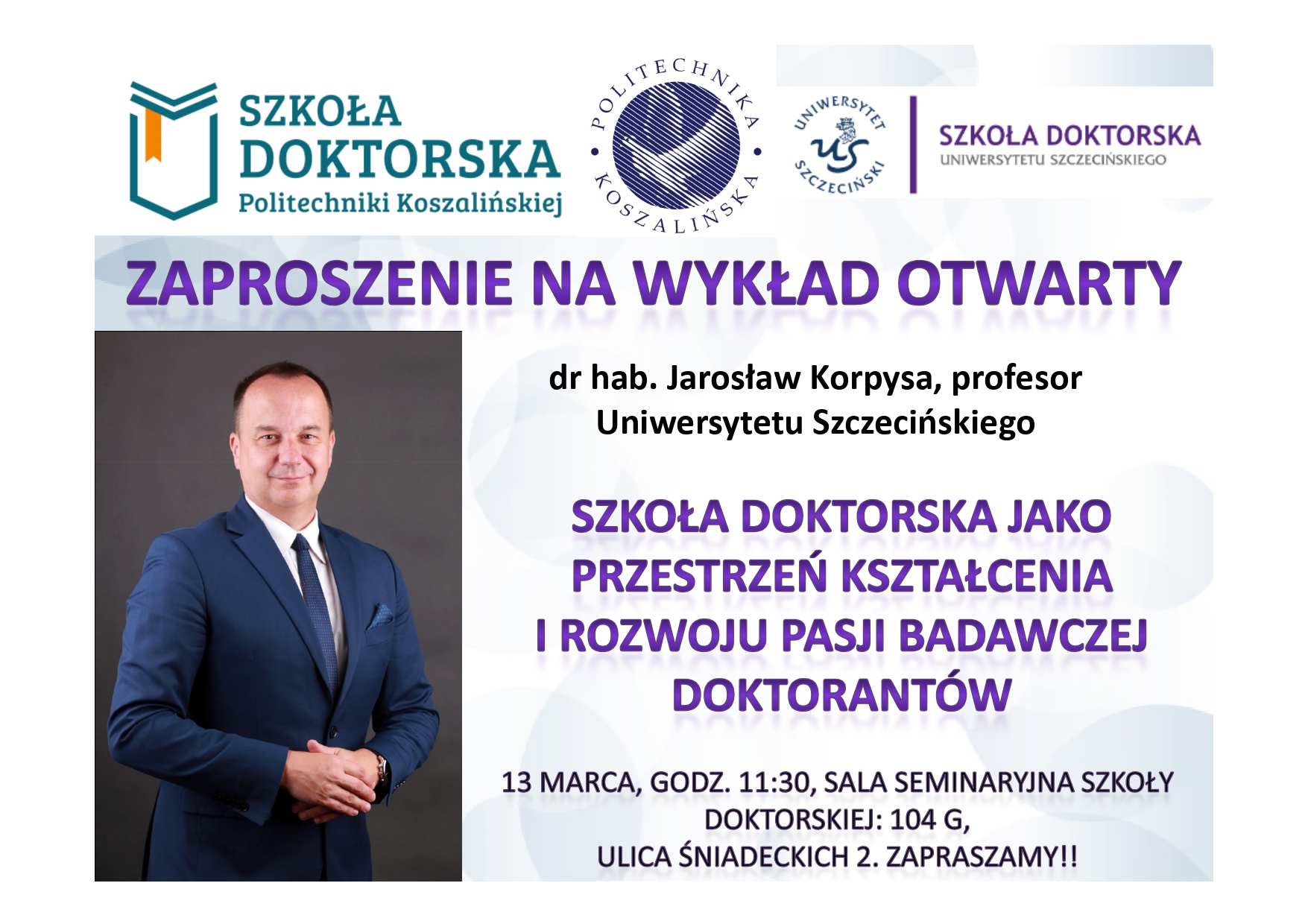 Dyrektor Szkoły Doktorskiej Politechniki Koszalińskiej, dr hab. Łukasz Bohdal, prof. PK, wraz z Samorządem Doktorantów PK zapraszają na wykład otwarty pt. „Szkoła Doktorska jako przestrzeń kształcenia i rozwoju pasji badawczej Doktorantów”, który wygłosi dr hab. Jarosław Korpysa, prof. Uniwersytetu Szczecińskiego.