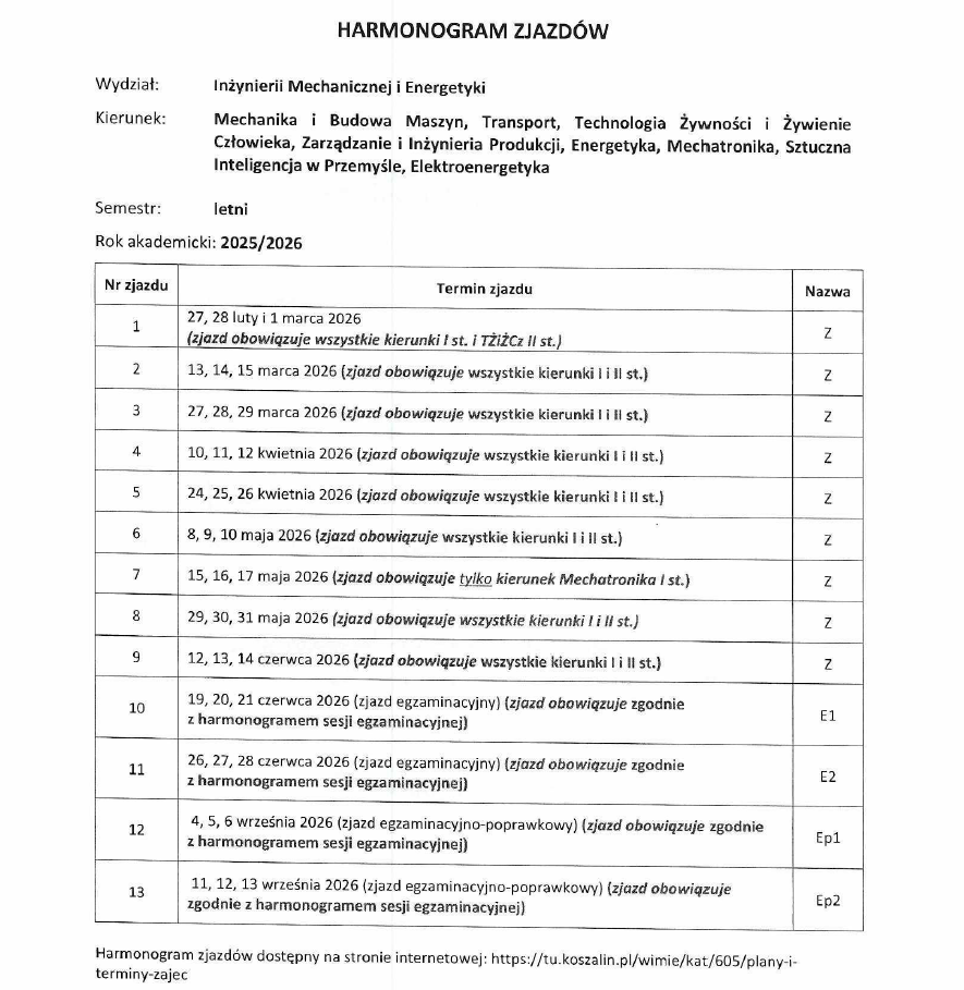Harmonogram zjazdów semestr letni 2025/2026