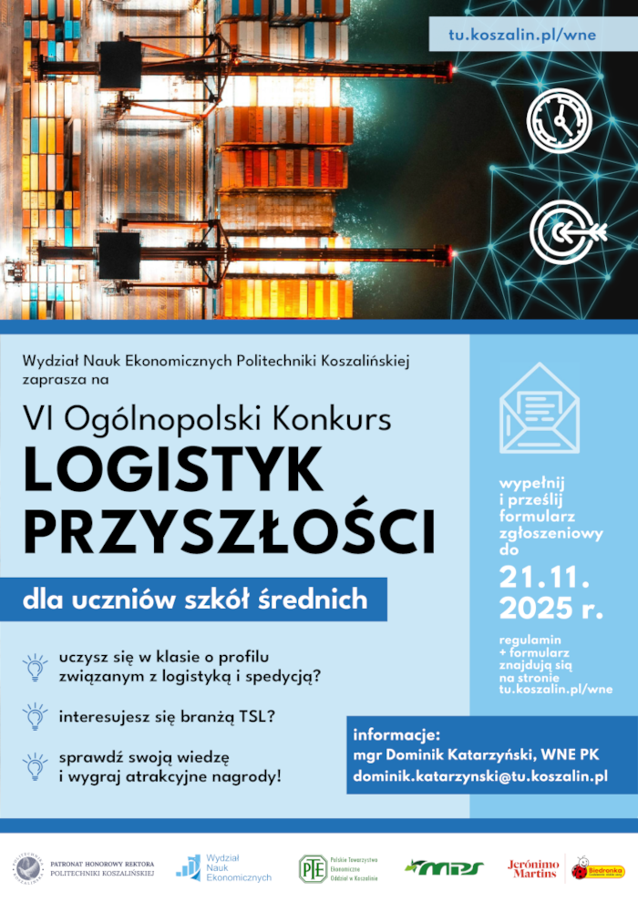 VI Ogólnopolski Konkurs "Logistyk Przyszłości" organizowany przez Wydział Nauk Ekonomicznych Politechniki Koszalińskiej jest przedsięwzięciem skierowanym do uczniów szkół średnich, którzy kształcą się w specjalnościach: technik logistyk i technik spedytor oraz zainteresowanych branżą TSL (Transport-Spedycja-Logistyka).