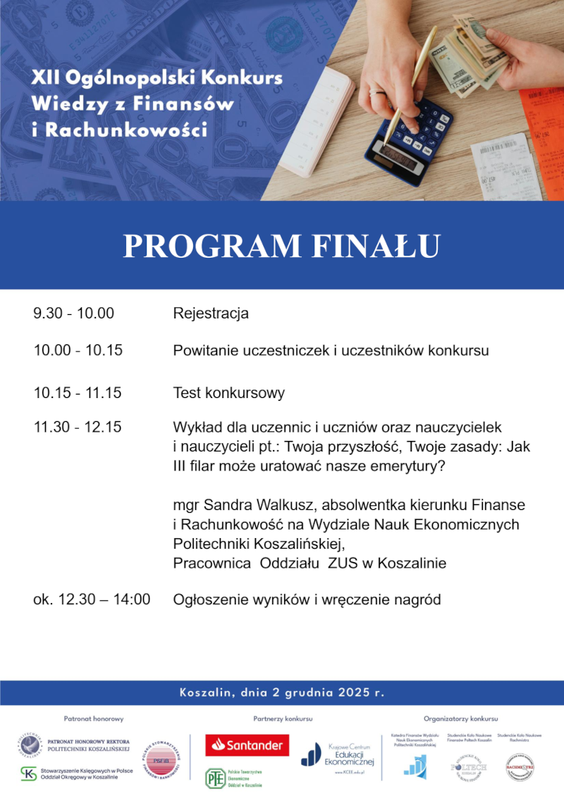 Katedra Finansów Wydziału Nauk Ekonomicznych Politechniki Koszalińskiej wraz ze Studenckim Kołem Naukowym Finansów POLTECH Koszalin oraz Studenckim Kołem Naukowym Rachmistrz serdecznie zapraszają uczniów szkół średnich do wzięcia udziału w XII Ogólnopolskim Konkursie Wiedzy z Finansów i Rachunkowości.