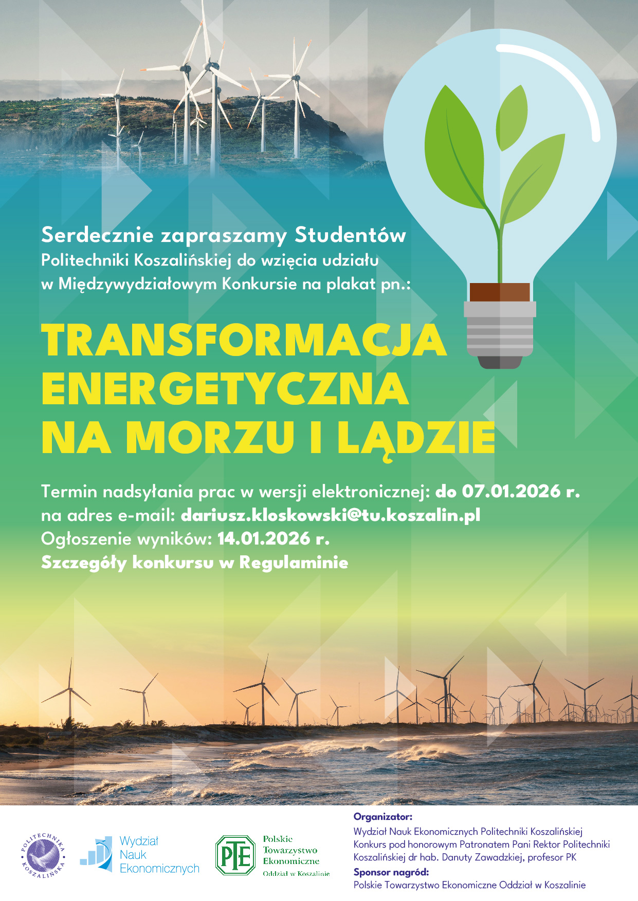 Zapraszamy wszystkich studentów Politechniki Koszalińskiej do udziału w Międzywydziałowym Konkursie na najciekawszy plakat pt.: "Transformacja energetyczna na morzu i lądzie". Celem konkursu jest zainteresowanie studentów Politechniki Koszalińskiej problematyką transformacji energetycznej związanej z systemowym procesem przechodzenia z tradycyjnych źródeł energii na odnawialne źródła energii (OZE).