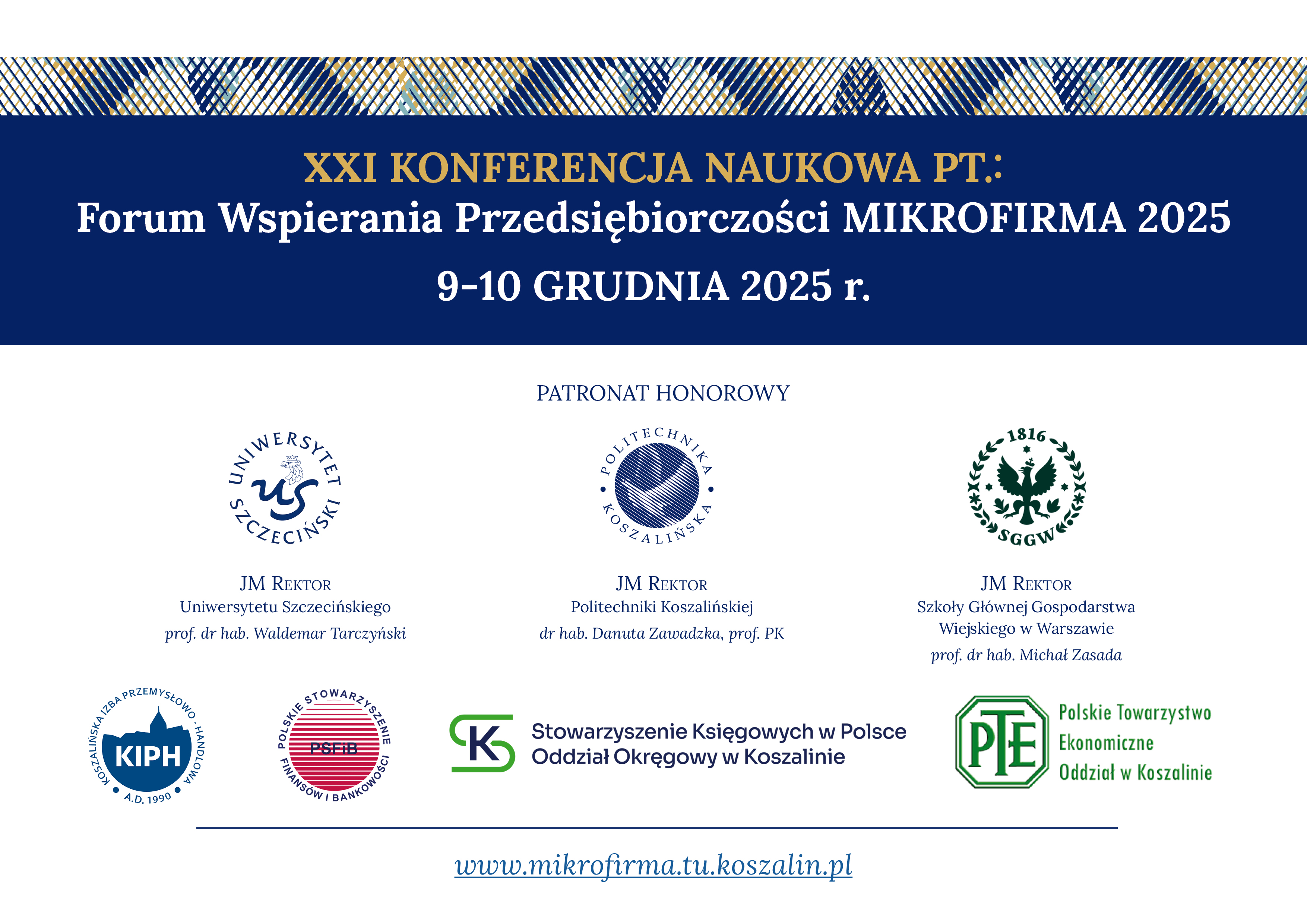 W dniach 9-10 grudnia 2025 r. w Mielnie odbędzie się XXI Konferencja Naukowa pt.: Forum Wspierania Przedsiębiorczości MIKROFIRMA 2025. Wydarzenie stanowi okazję do zaprezentowania wyników badań naukowych dotyczących m.in. uwarunkowań rozwoju małych i średnich przedsiębiorstw.