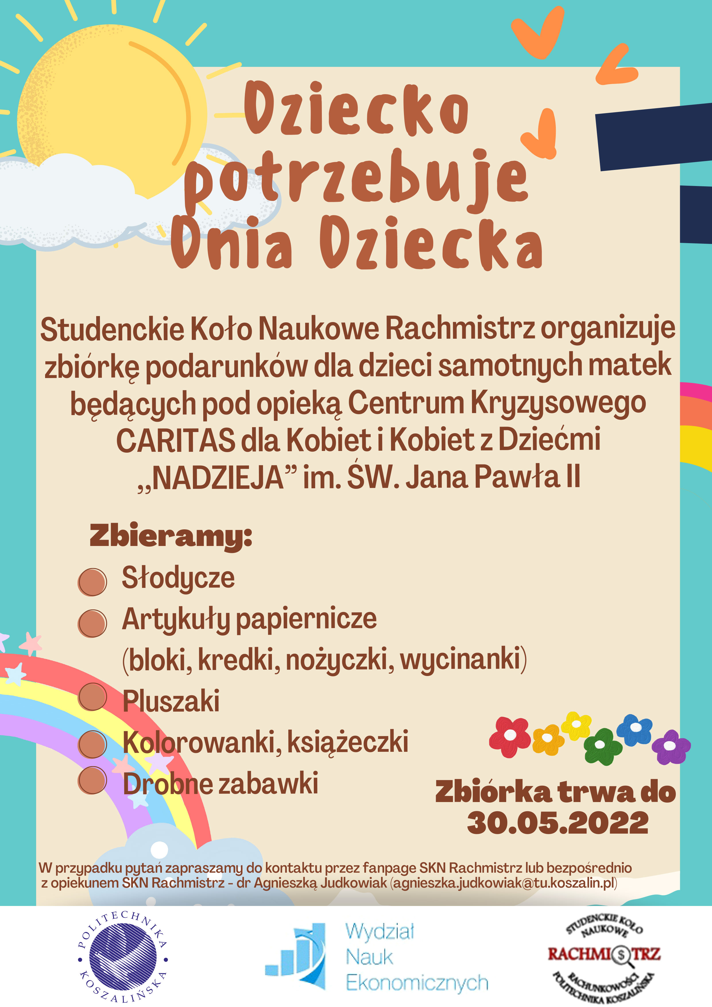 Studenckie Koło Naukowe (SKN) „Rachmistrz”, działające przy Wydziale Nauk Ekonomicznych Politechniki Koszalińskiej, jest organizatorem zbiórki „Dziecko potrzebuje Dnia Dziecka”.