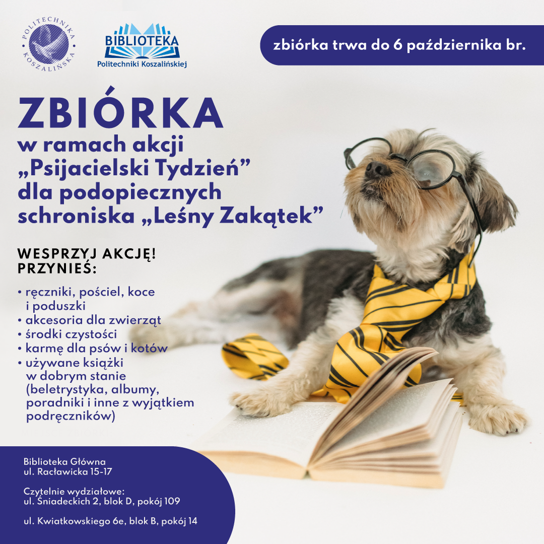 Z okazji Światowego Dnia Zwierząt Politechnika Koszalińska przyłącza się do - organizowanej przez Galerię Emka w Koszalinie - akcji pod hasłem „Psijacielski Tydzień”. Celem akcji jest pomoc mieszkańcom schroniska Leśny Zakątek w Koszalinie. Akcją w imieniu Politechniki Koszalińskiej pokieruje biblioteka uczelniana.