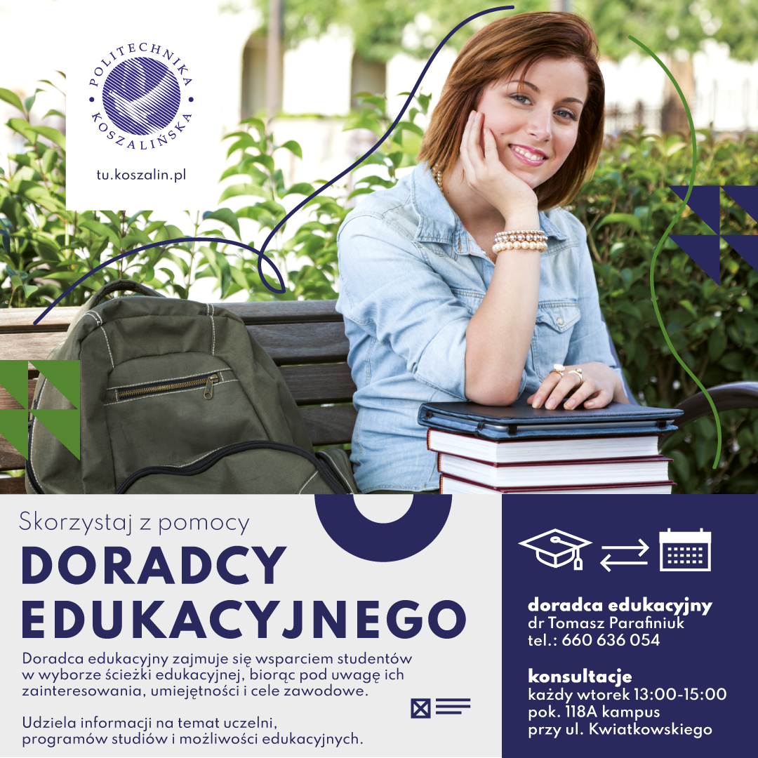 Doradca edukacyjny zajmuje się wsparciem studentów w wyborze ścieżki edukacyjnej, biorąc pod uwagę ich zainteresowania, umiejętności i cele zawodowe. Udziela informacji na temat uczelni, programów studiów i możliwości edukacyjnych. Na konsultacje można zgłosić się w każdy wtorek w godz. 13-15, pok. 118A w kampusie przy ul. Kwiatkowskiego.