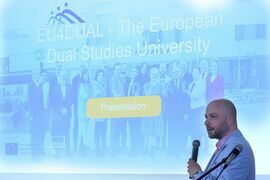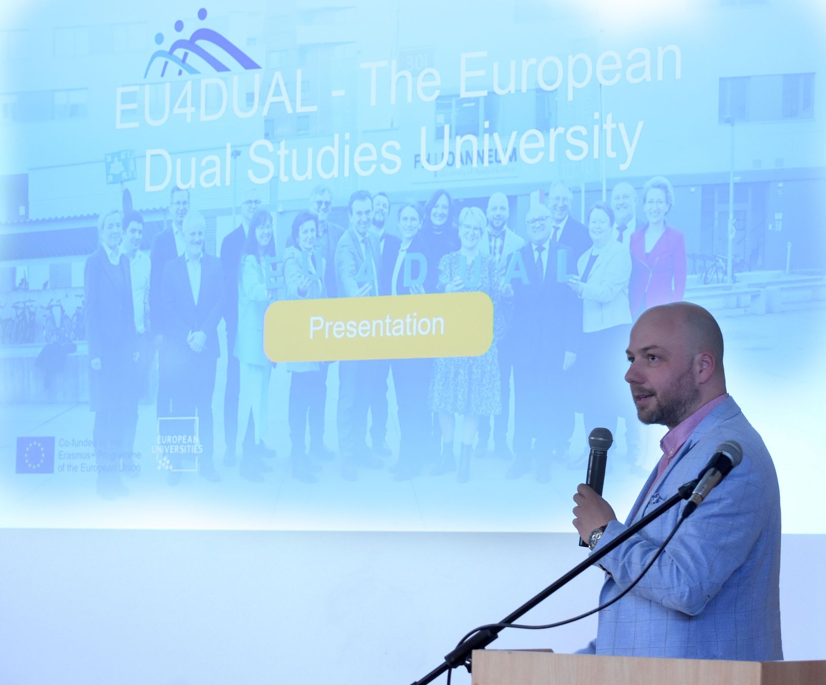 Prof. Krzysztof Wasilewski przedstawił gościom szczegóły projektu EU4Dual, korzyści jakie wynikają z partnerstwa w projekcie, cele jakie uczelnie chcą osiągnąć i czym charakteryzuje się kształcenie dualne.