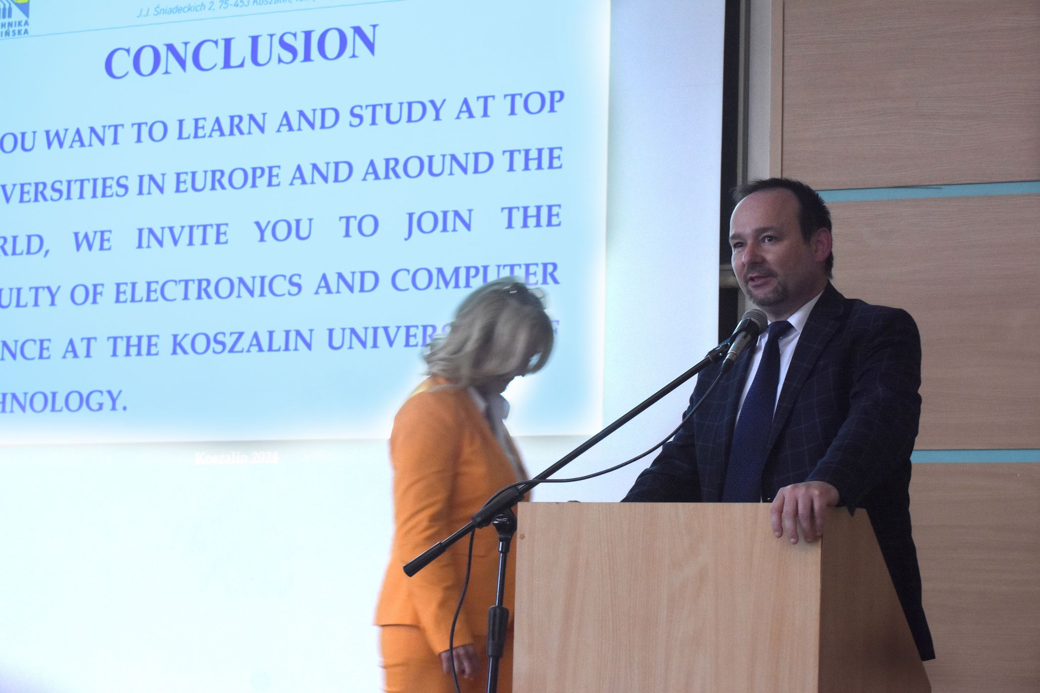 Wykład dotyczący połączenia nauk ścisłych z humanistyką wygłosiła dr Izabela Dixon z Wydziału Humanistycznego Politechniki Koszalińskiej, w którym skupiła się na słowach i języku. Podczas wydarzenia prof. dr hab. inż. Krzysztof Rokosz, dziekan Wydziału Elektroniki i Informatyki, wspólnie z dr inż. Anetą Hapką, prodziekan wydziału, opowiedzieli o doświadczeniach w realizacji programów CEEPUS i Erasmus+.