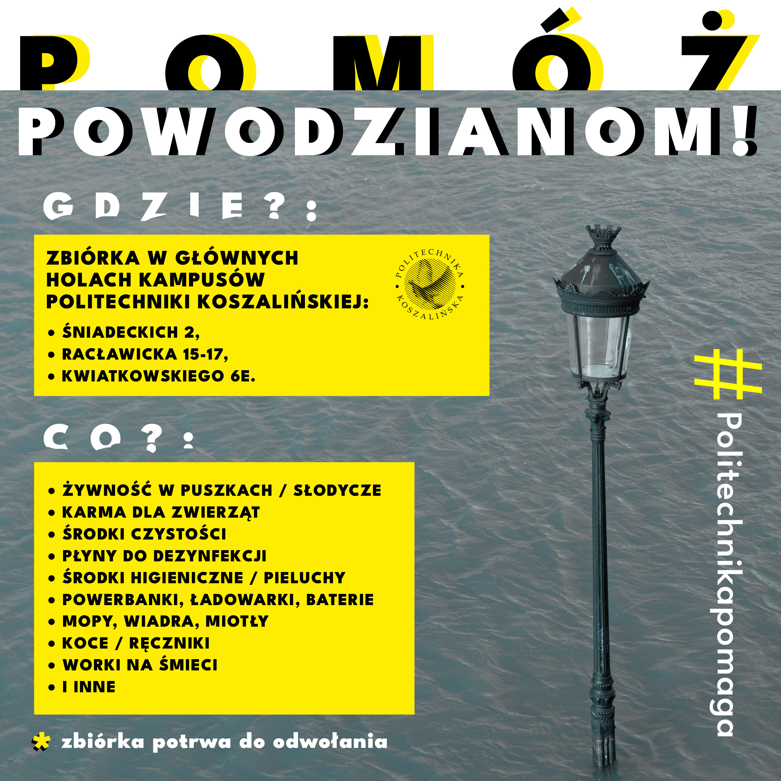 Przypomnijmy, że od środy na Politechnice Koszalińskiej trwa zbiórka darów dla powodzian. Artykuły można przynosić do wszystkich kampusów uczelni: przy ul. Śniadeckich 2, ul. Racławickiej 15-17, ul. Kwiatkowskiego 6e. W głównych holach kampusów przygotowane są kosze gdzie można zostawiać dary i wspomóc potrzebujących.