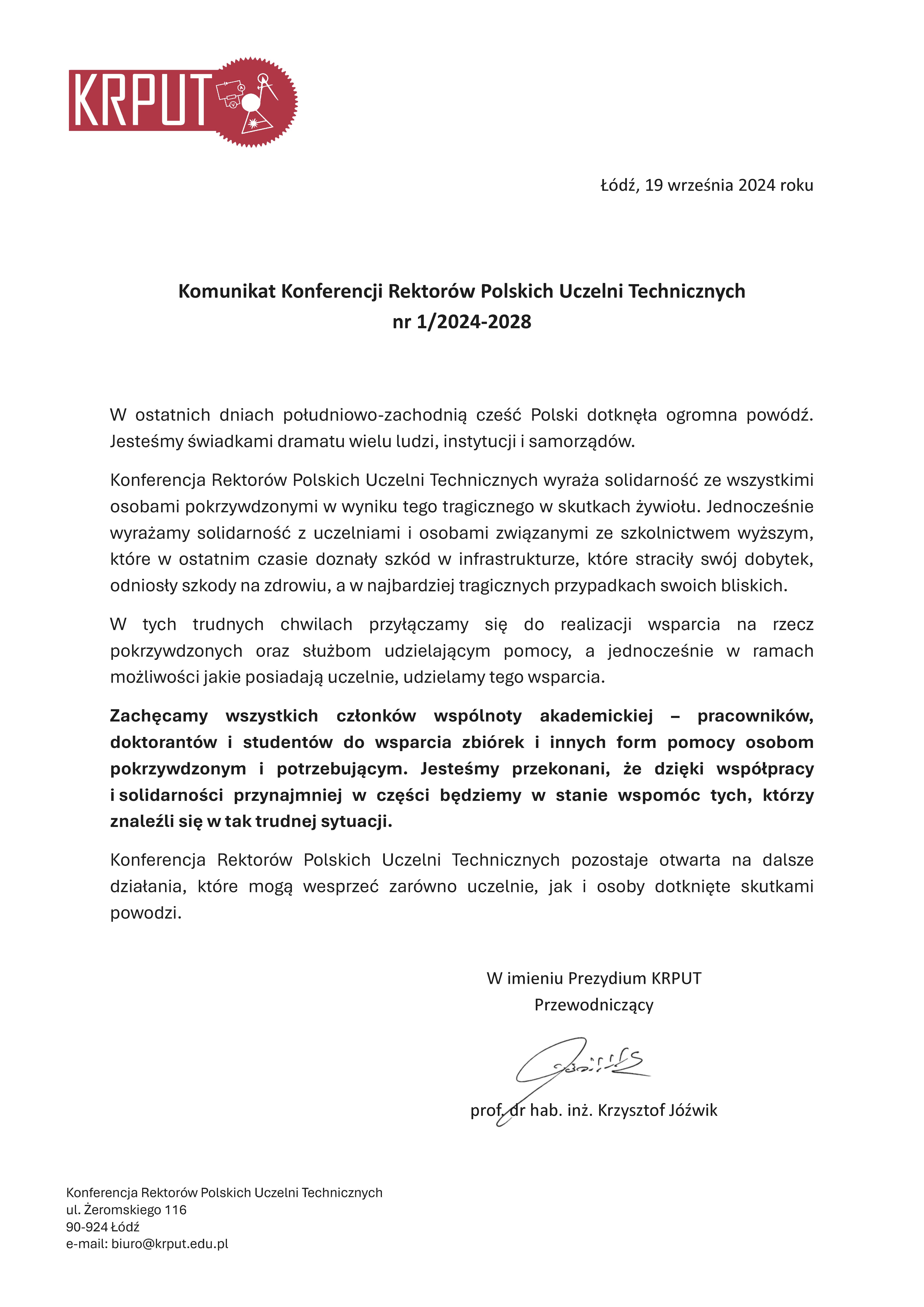 W tym tygodniu w imieniu prezydium KRPUT przewodniczący prof. dr hab. inż. Krzysztof Jóźwik zaapelował do władz uczelni i wszystkich członków wspólnoty akademickiej do wsparcia zbiórek i innych form pomocy osobom pokrzywdzonym i potrzebującym. Politechnika Koszalińska również jest członkiem stowarzyszenia a rektor naszej uczelni dr hab. Danuta Zawadzka, prof. PK, pełni funkcję wiceprzewodniczącej KRPUT.
