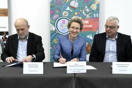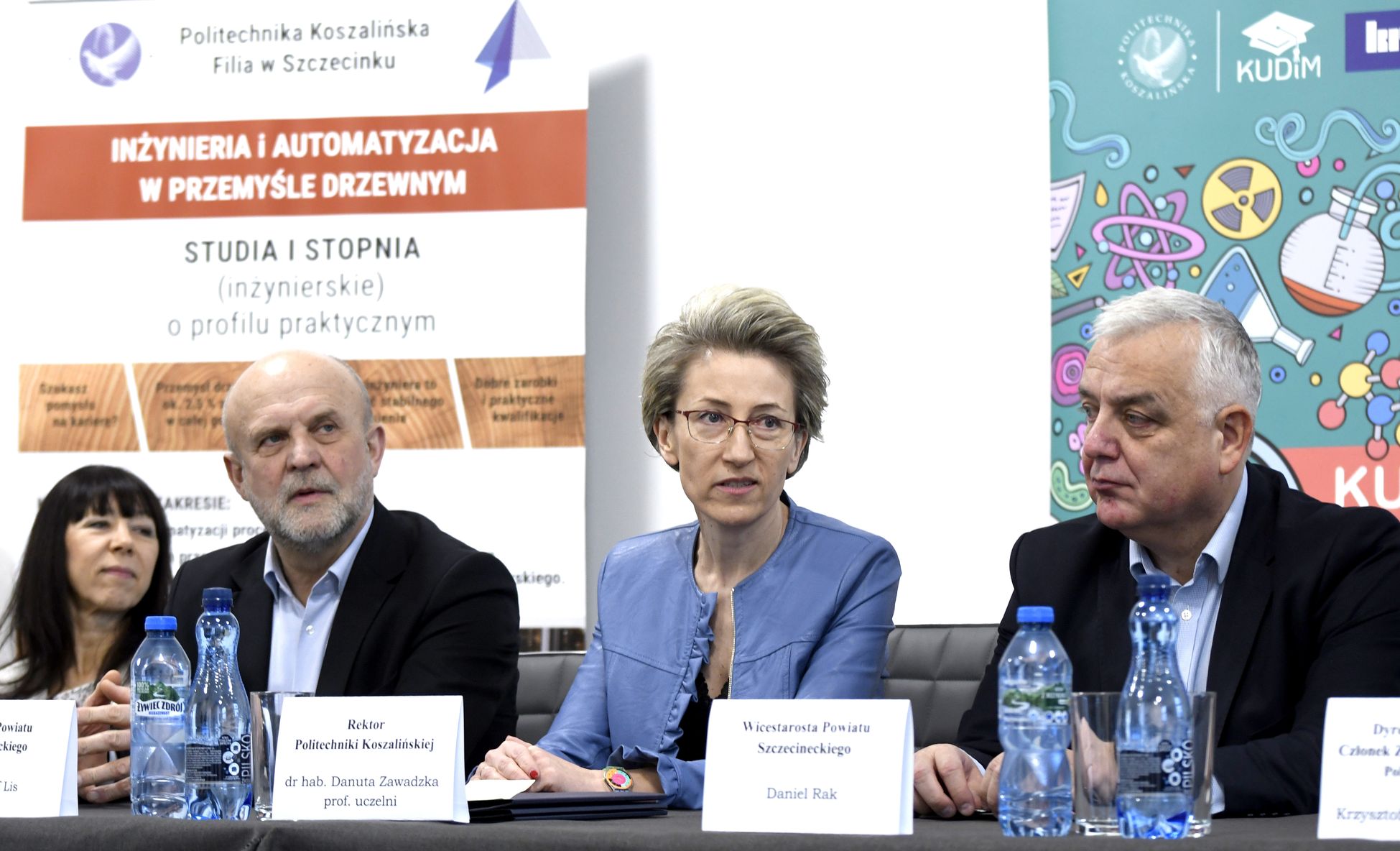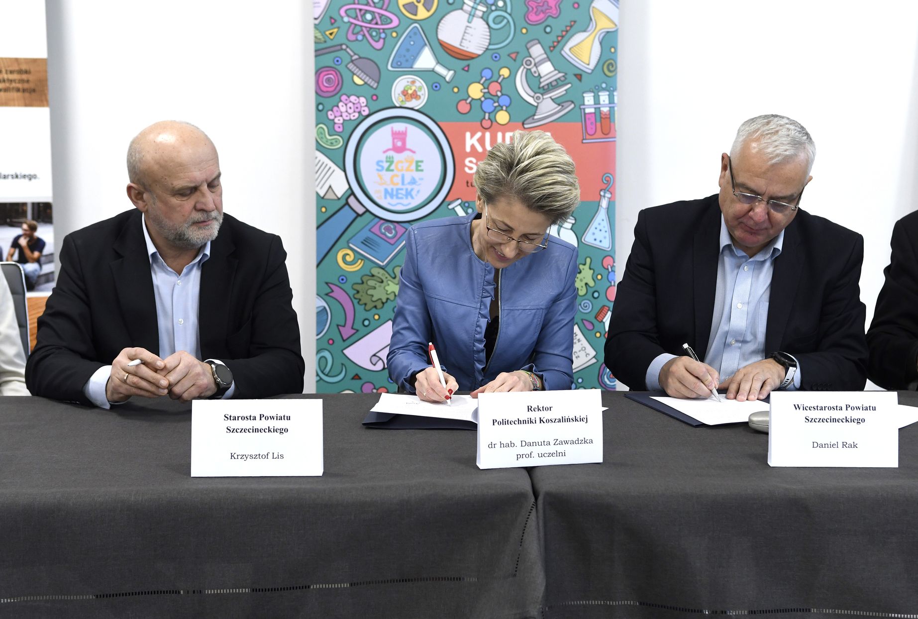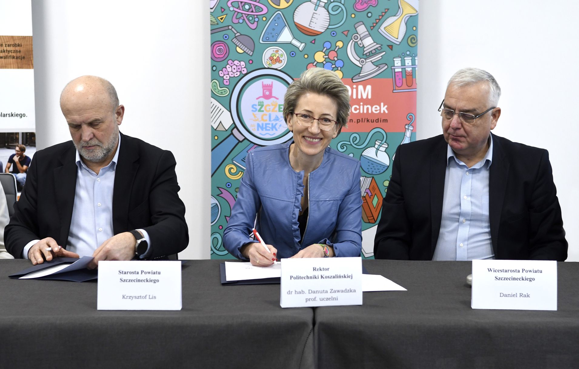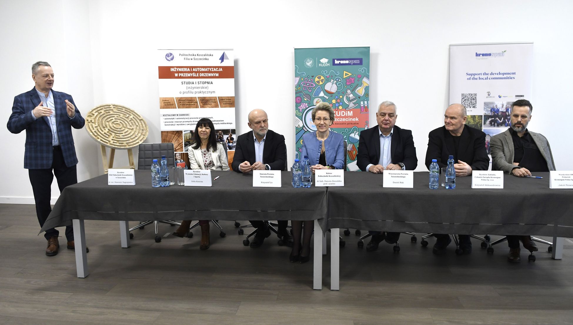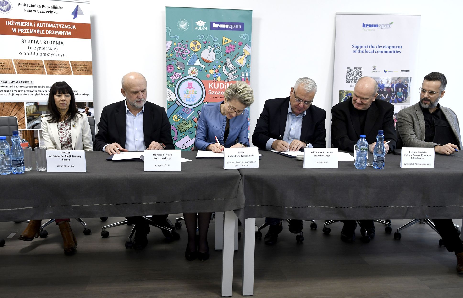 Porozumienie w obecności dyrektorów szkół podpisali: rektor Politechniki Koszalińskiej, dr hab. Danuta Zawadzka, prof. PK, starosta szczecinecki Krzysztof Lis, wicestarosta Daniel Rak, dyrektor zakładu i członek zarządu spółki Kronospan, Krzysztof Aleksandrowicz oraz prokurent Jakub Piniarski.