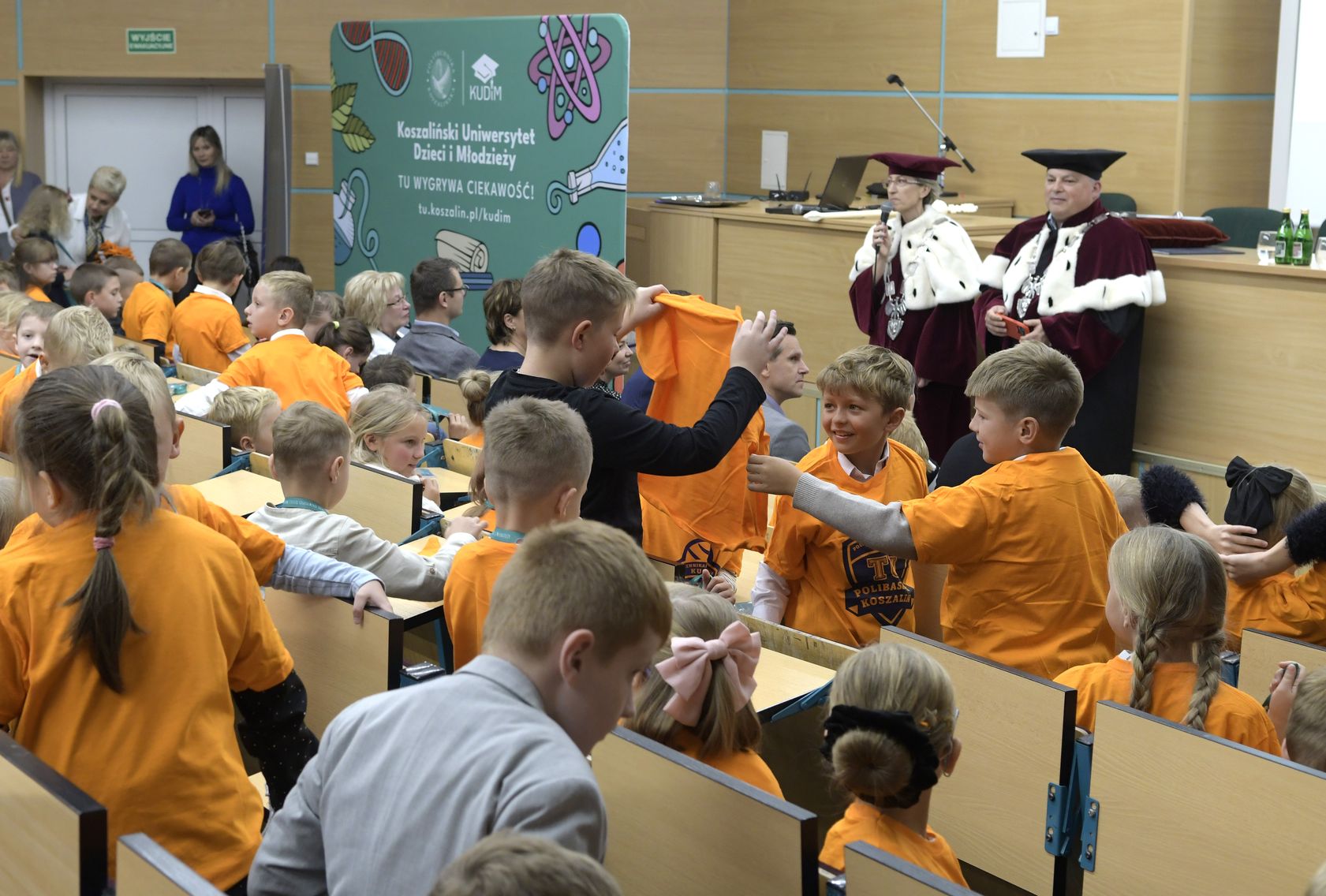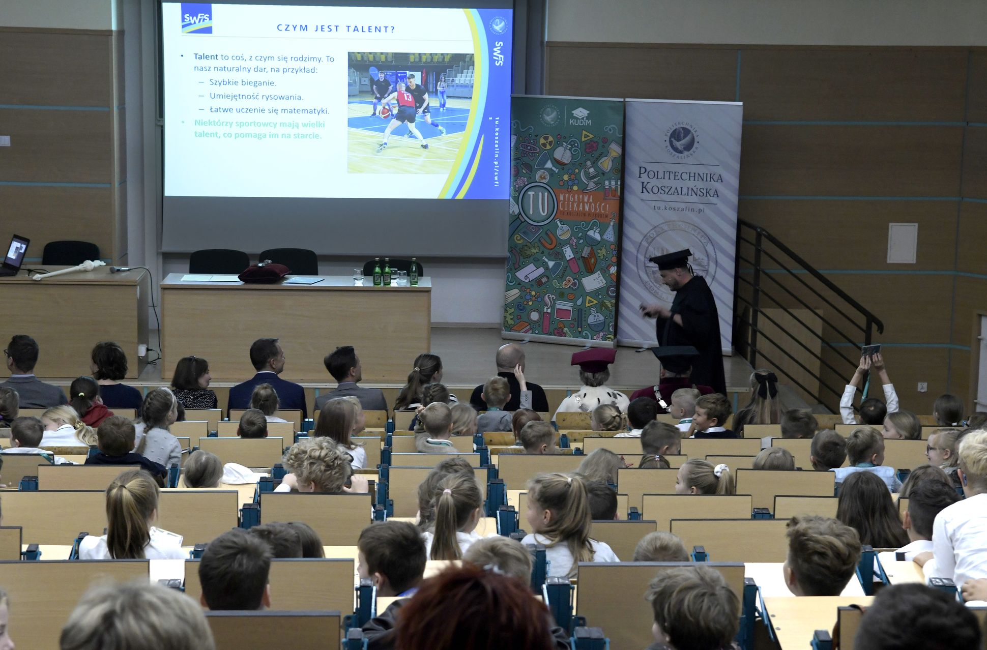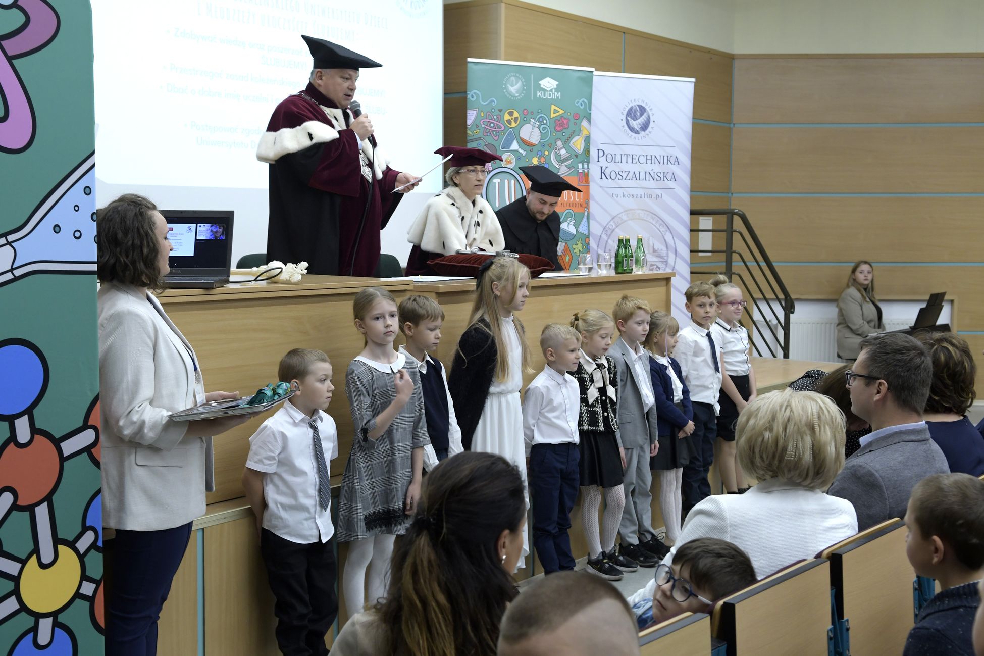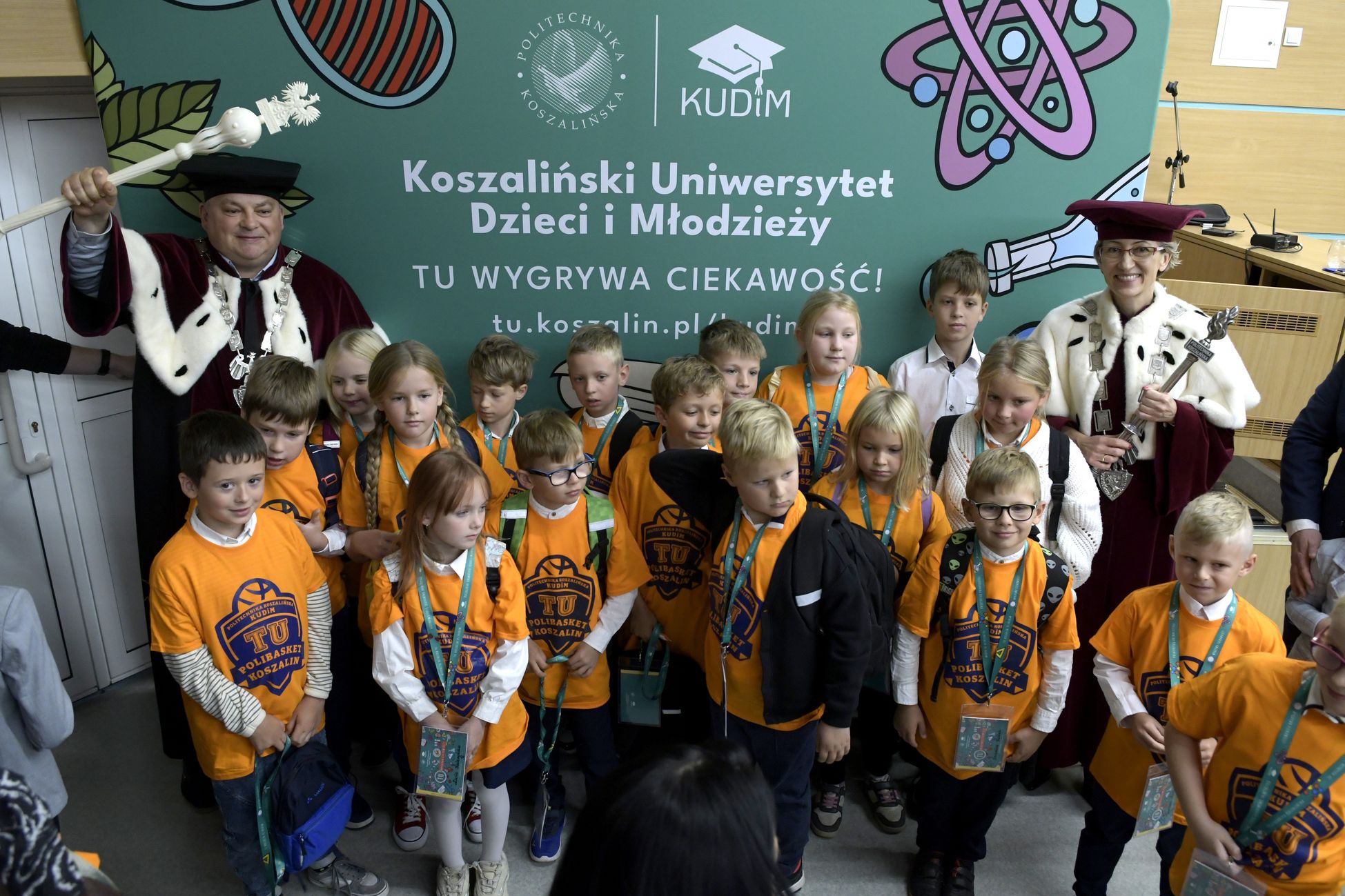 W sobotę, 4 października odbyła się inauguracja Koszalińskiego Uniwersytetu Dzieci i Młodzieży Politechniki Koszalińskiej. Dzieci w auli kampusu przy ulicy Śniadeckich przywitała dr hab. Danuta Zawadzka, prof. PK, rektor Politechniki Koszalińskiej i dr hab. inż. Tomasz Królikowski, prof. PK, prorektor ds. studenckich. Młodzież w społeczność akademicką wprowadził także dr hab. Grzegorz Przekota, prof. PK, dziekan Wydziału Nauk Ekonomicznych. Wykład na temat sportowych talentów i możliwości jakie drzemią w młodym pokoleniu przedstawił trener reprezentacji Politechniki Koszalińskiej w koszykówce, mgr Michał Sugier, podczas którego ogłosił powołanie nowego klubu koszykarskiego Politechniki Koszalińskiej TU Polibasket. Uroczystość uświetnił występ Dziecięcej Akademii Chóralnej Pomerania Cantat w Koszalinie. Chór po immatrykulacji odśpiewał hymn studencki, Gaudeamus igitur. Głównym celem Uniwersytetu jest inspirowanie młodych umysłów do odkrywania świata i rozwijania pasji w różnych dziedzinach – od nauk ścisłych, przez technikę i przyrodę, aż po sztukę i sport. Uczelnia prowadzi zajęcia w dwóch grupach wiekowych: w grupie dziecięcej (klasa I-V) i młodzieżowej (klasa VI-VIII). W roku akademickim 2025/2026 w zajęciach KUDiM-u bierze udział około 250 dzieci w wieku od 6 do 15 lat. Młodzi studenci uczestniczą w wykładach z różnych dziedzin – od biologii i chemii, przez fizykę i mechanikę. Są spotkania z ciekawymi ludźmi, warsztaty i zajęcia w laboratoriach. Od 2016 roku, dzięki wsparciu firmy Kronospan, oddział Koszalińskiego Uniwersytetu Dzieci i Młodzieży Politechniki Koszalińskiej funkcjonuje także w Szczecinku.