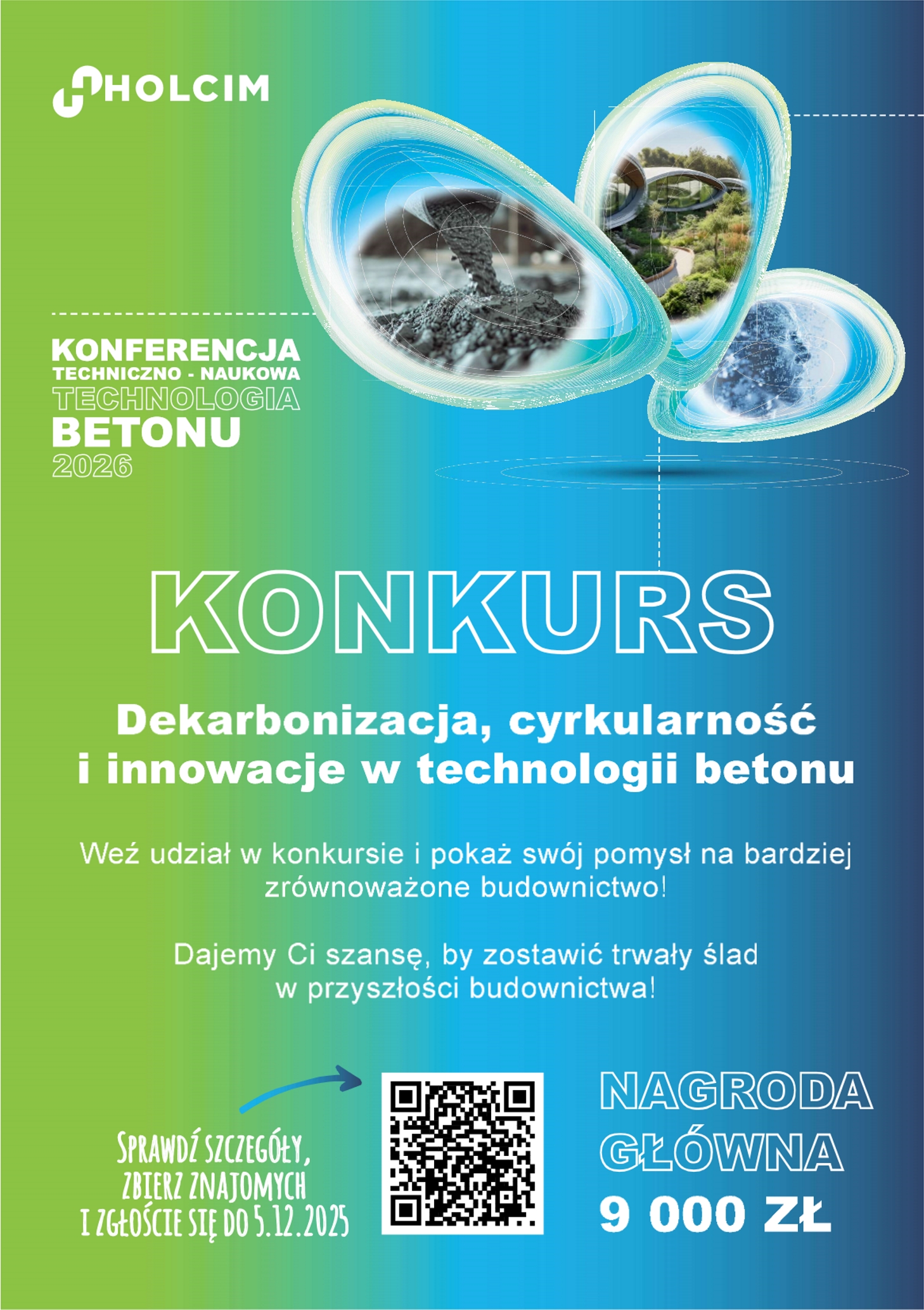 Podczas przyszłorocznej cyklicznej Konferencji Technologia Betonu organizujemy konkurs dla studentów pt. „Dekarbonizacja, cyrkularność i innowacje w technologii betonu”.