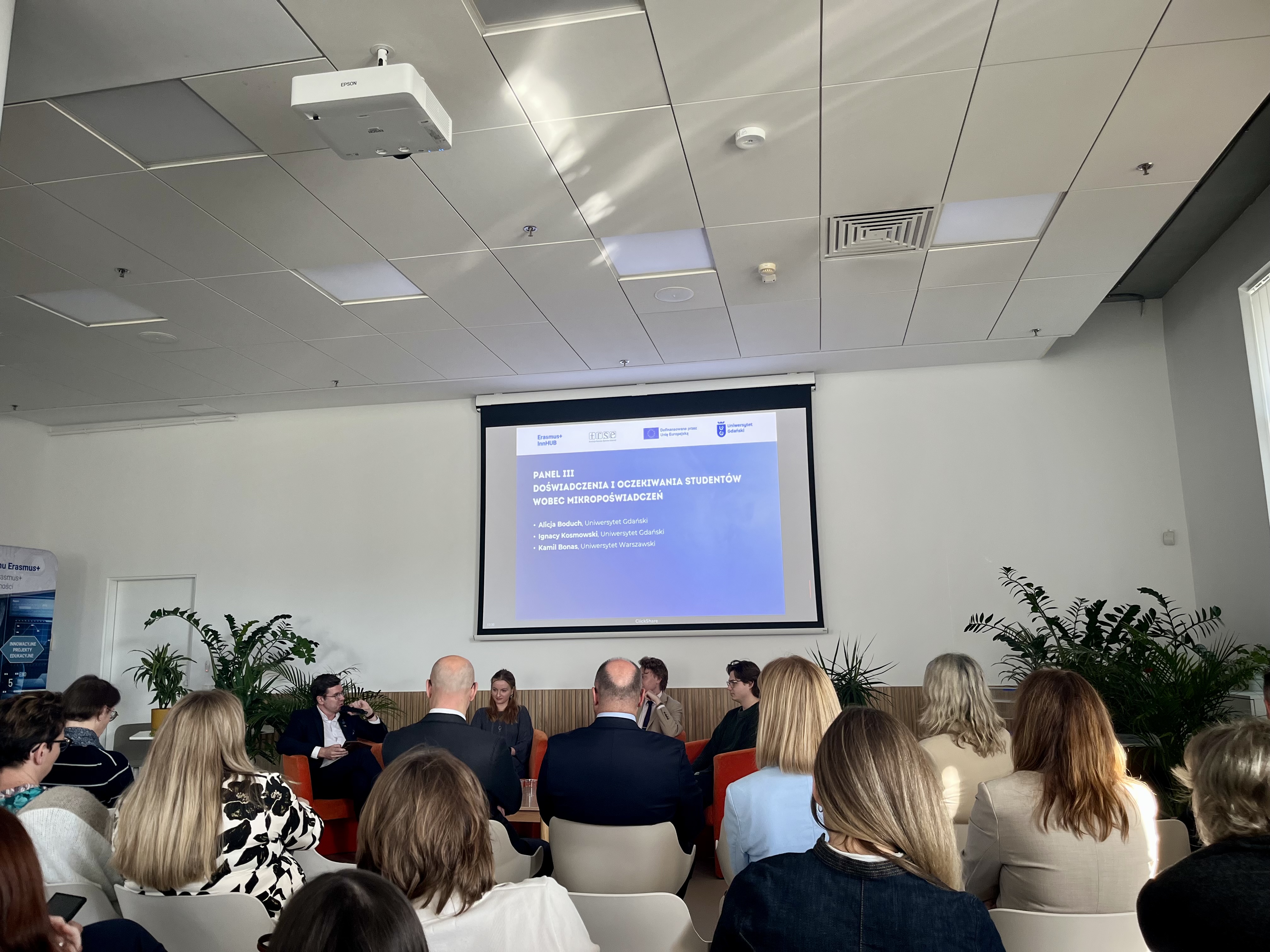 Wystąpienie otwierające, zatytułowane „Mikropoświadczenia w zintegrowanym systemie akademickim. Perspektywa polska - nadzieje i wyzwania”, wygłosił dr hab. Jakub Brdulak, prof. SGH, przedstawiciel Polskiej Komisji Akredytacyjnej. Wskazał on na potrzebę budowania spójnych ram wdrażania mikropoświadczeń oraz znaczenie współpracy pomiędzy uczelniami, instytucjami publicznymi i sektorem prywatnym. Podczas pierwszego panelu dyskusyjnego ,,Mikropoświadczenia w praktyce akademickiej” zaprezentowano przykłady wdrażania tego rozwiązania w polskich uczelniach. Swoimi doświadczeniami podzielili się m.in. Jolanta Urbanikowa z Uniwersytetu Warszawskiego, dr inż. Agnieszka Schwalbe-Tiszbierek z Politechniki Opolskiej i Magdalena Sawicz z Uniwersytetu Gdańskiego.