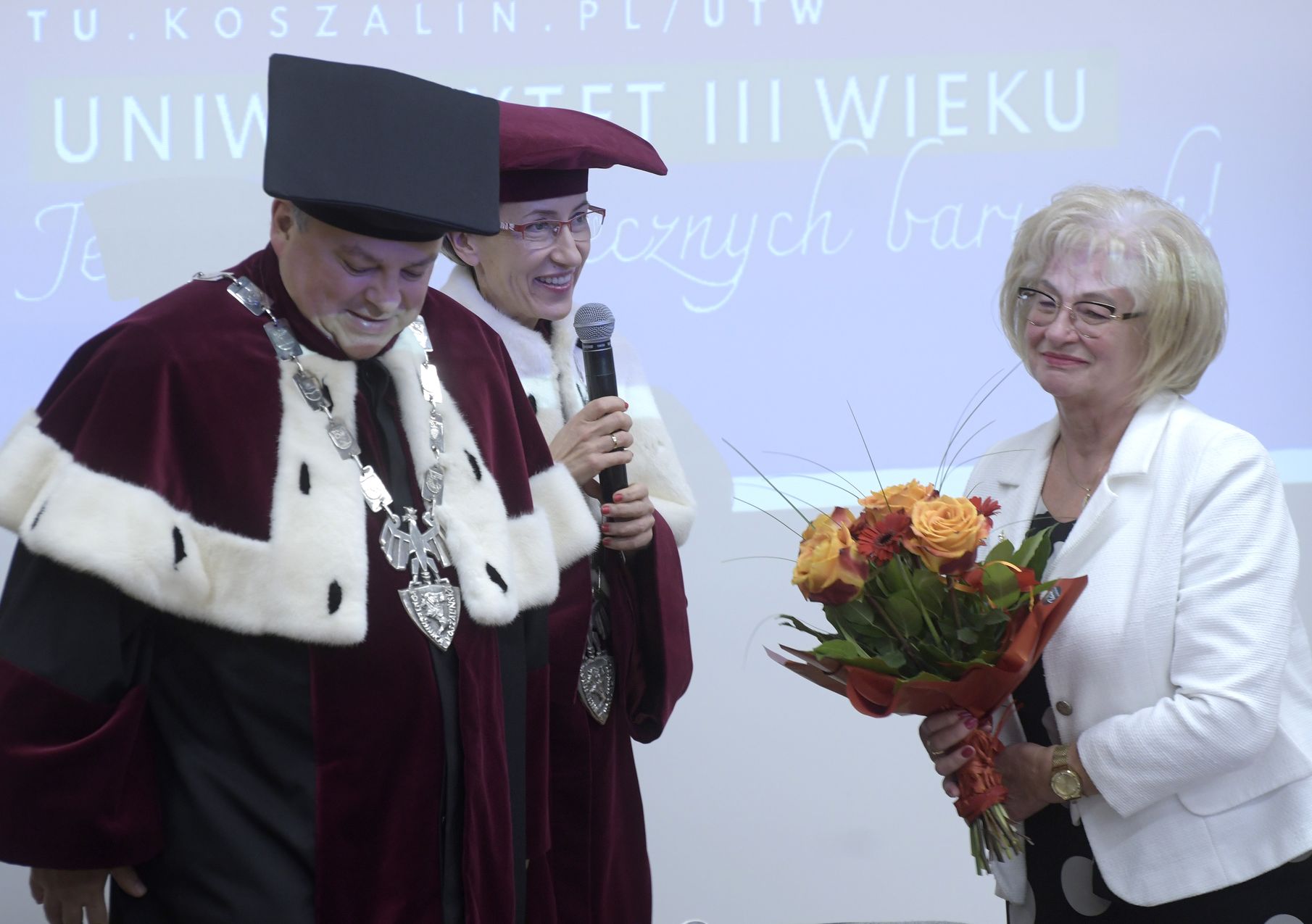 W środę, 29 października o godzinie 17:00 w dwóch aulach kampusu Politechniki Koszalińskiej przy ulicy Śniadeckich odbyła się Uroczysta Inauguracja nowego roku akademickiego Uniwersytetu Trzeciego Wieku Politechniki Koszalińskiej. Rektor Politechniki Koszalińskiej, dr hab. Danuta Zawadzka, prof. PK powitała wszystkich zgromadzonych wraz z prorektorem ds. studenckich dr hab. inż. Tomaszem Królikowskim, prof. PK i przewodniczącą Samorządu Uniwersytetu Trzeciego Wieku, Barbarą Perzyną. Jak powiedziała prof. Danuta Zawadzka, cytując Henry'ego Forda: "Człowiek przestaje być młody, gdy przestaje się uczyć." - Dlatego tym bardziej cieszę się, że tak wielu z Państwa zdecydowało się zostać słuchaczami UTW. Przemówienia inauguracyjne wygłosili: dziekan Wydziału Nauk Ekonomicznych Politechniki Koszalińskiej, dr hab. Grzegorz Przekota, prof. PK i dziekan Wydziału Inżynierii Lądowej, Środowiska i Geodezji, dr hab. inż. Jacek Domski, prof. PK. Wykład na temat telekomunikacji pt. „Od tam-tam'ów do smartfona”, zaprezentowała prodziekan ds. studenckich Wydziału Elektroniki i Informatyki Politechniki Koszalińskiej, dr inż. Katarzyna Jagodzińska. Uroczystość uświetnił Chór Politechniki Koszalińskiej "Canzona" pod batutą dr hab. Radosława Wilkiewicza, prof. AS, który oprócz hymnu państwowego i "Gaudeamus igitur" wykonał swoją wersję utworu Leonarda Cohena - "Hallelujah". Inauguracja roku akademickiego 2025 / 2026 Uniwersytetu Trzeciego Wieku zgromadziła w środowe popołudnie ponad 550 osób.