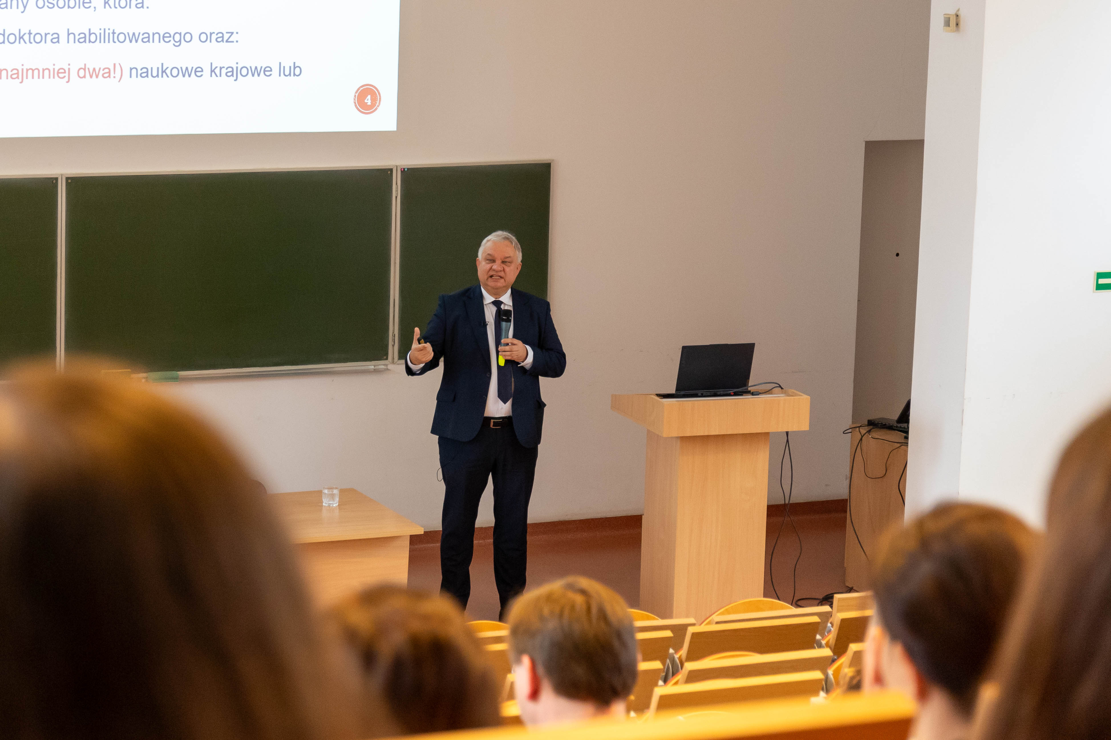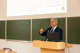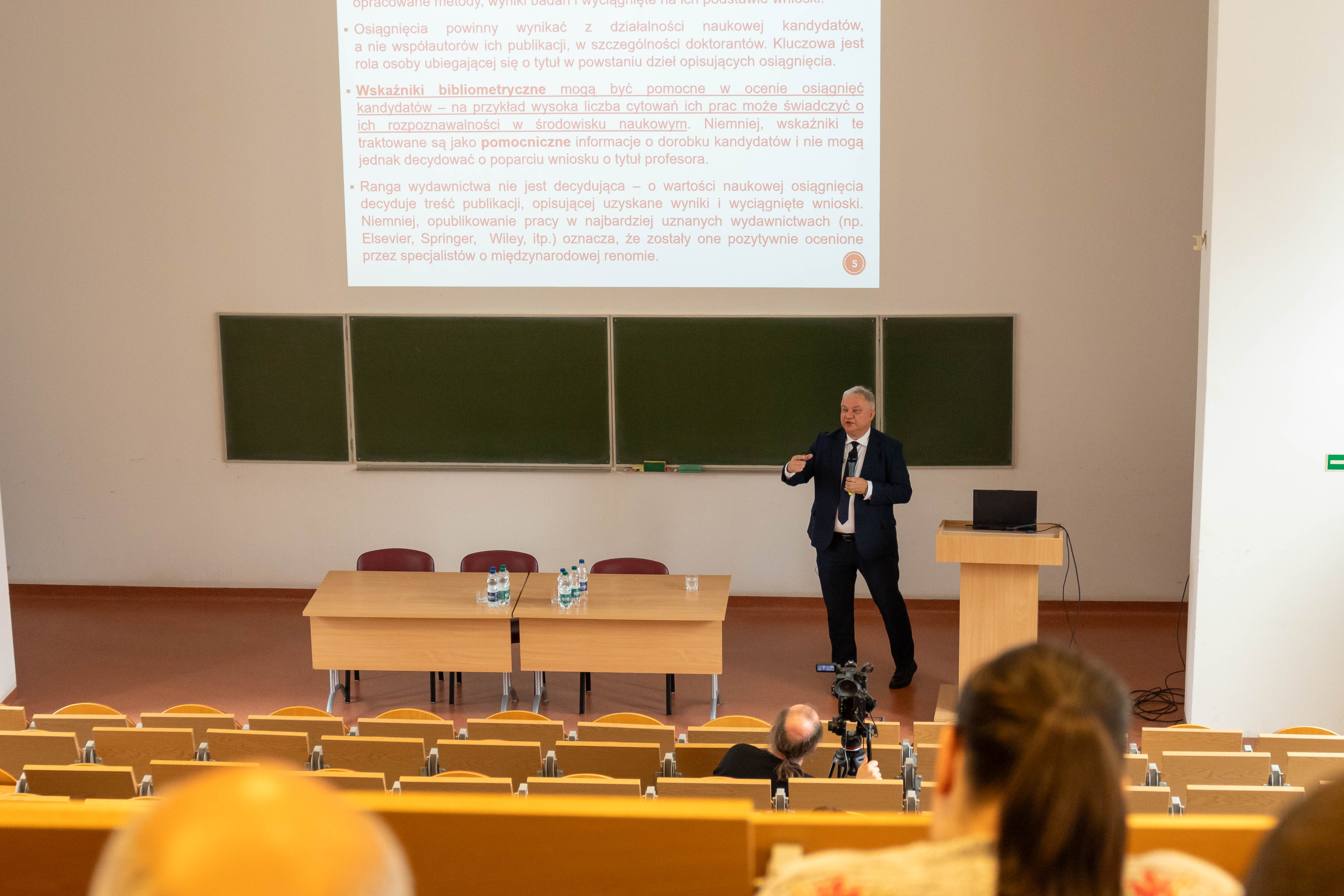 We wtorek, 18 listopada w auli kampusu Politechniki Koszalińskiej przy ulicy Racławickiej prof. dr hab. inż. Andrzej Seweryn wygłosił wykład pt. „Procedury i kryteria w postępowaniach o nadanie stopnia i tytułów naukowych”. Tematyka spotkania dotyczyła stosowania procedur awansowych pracowników jednostek szkolnictwa wyższego i proponowanych zmian w nowych regulacjach prawnych.