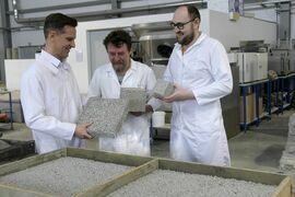 Przypomnijmy, że prace badawcze są prowadzone dwutorowo. W ramach realizowanego od początku października 2025 r. projektu badawczego opracowywane są receptury kompozytu cementowego, który będzie używany do produkcji lekkich posadzek budowlanych. W przypadku tego materiału ważne są właściwości izolacyjne i wytrzymałość na obciążenia statyczne i dynamiczne.