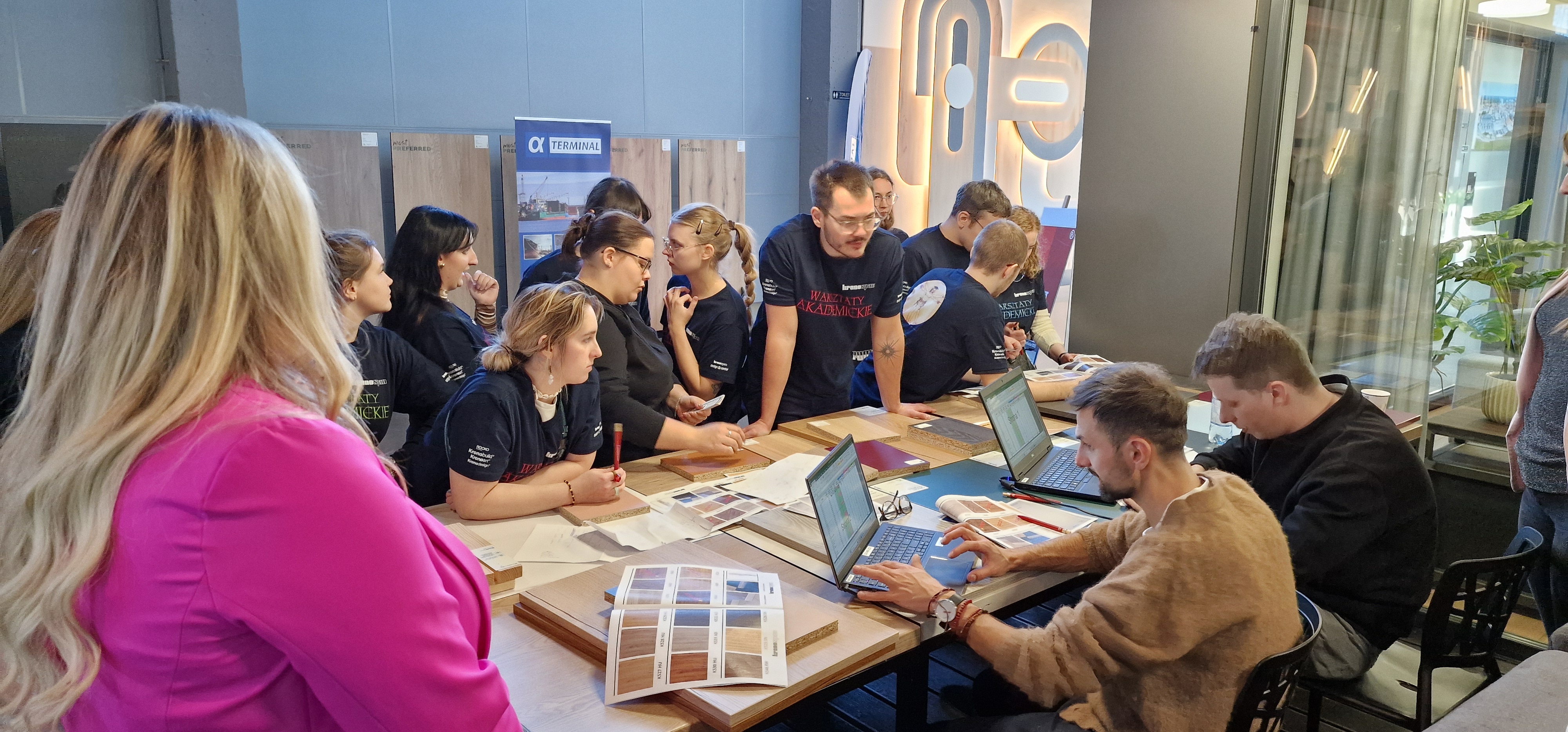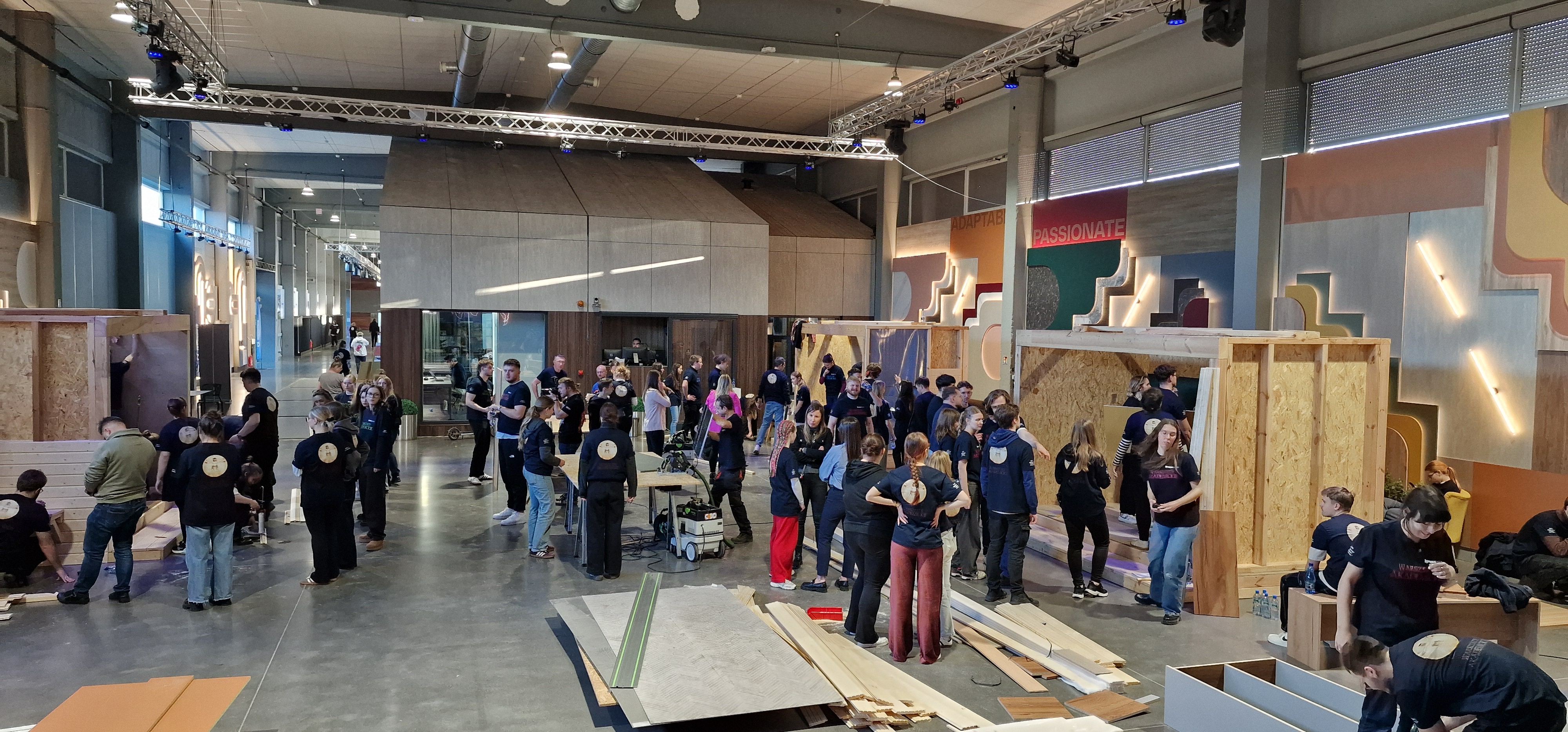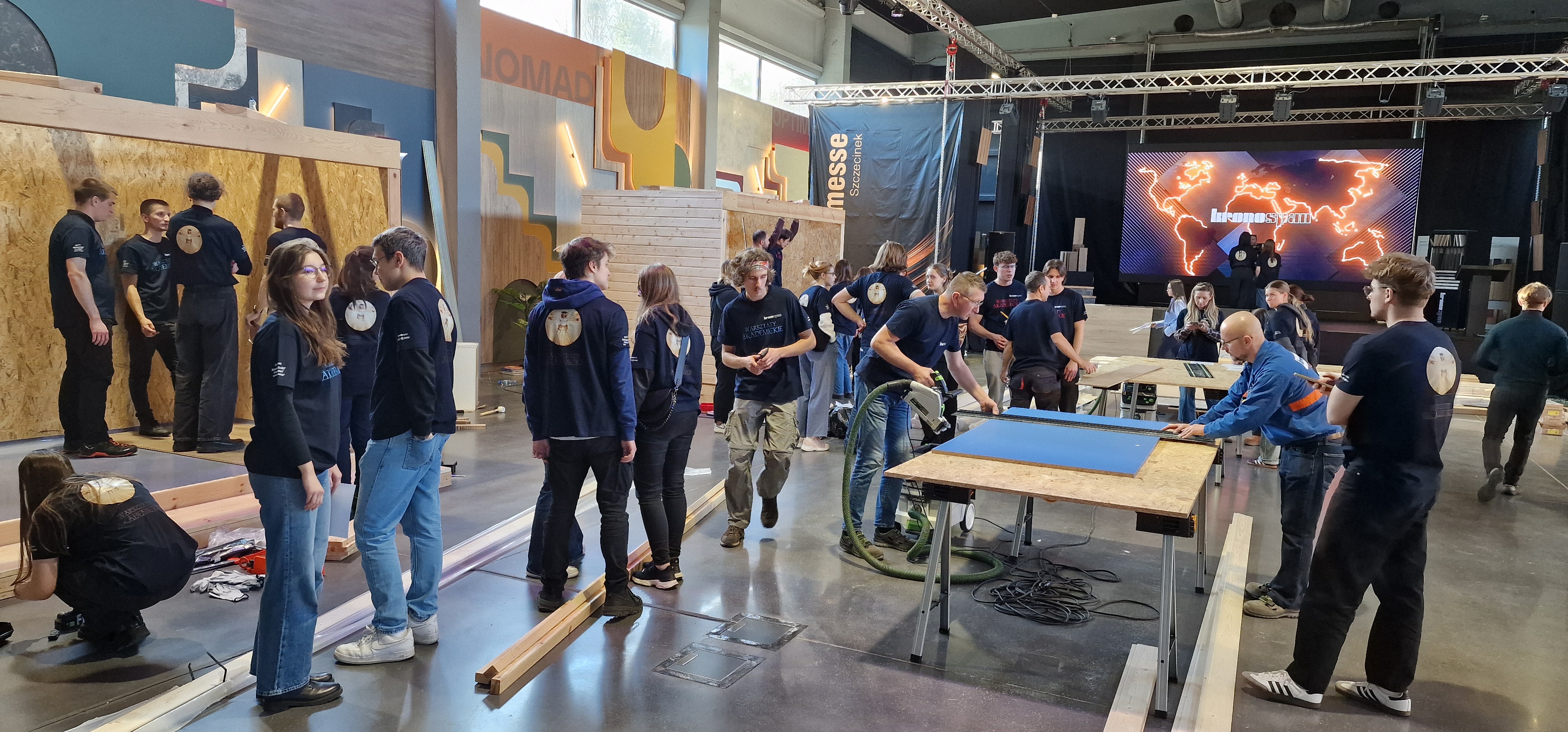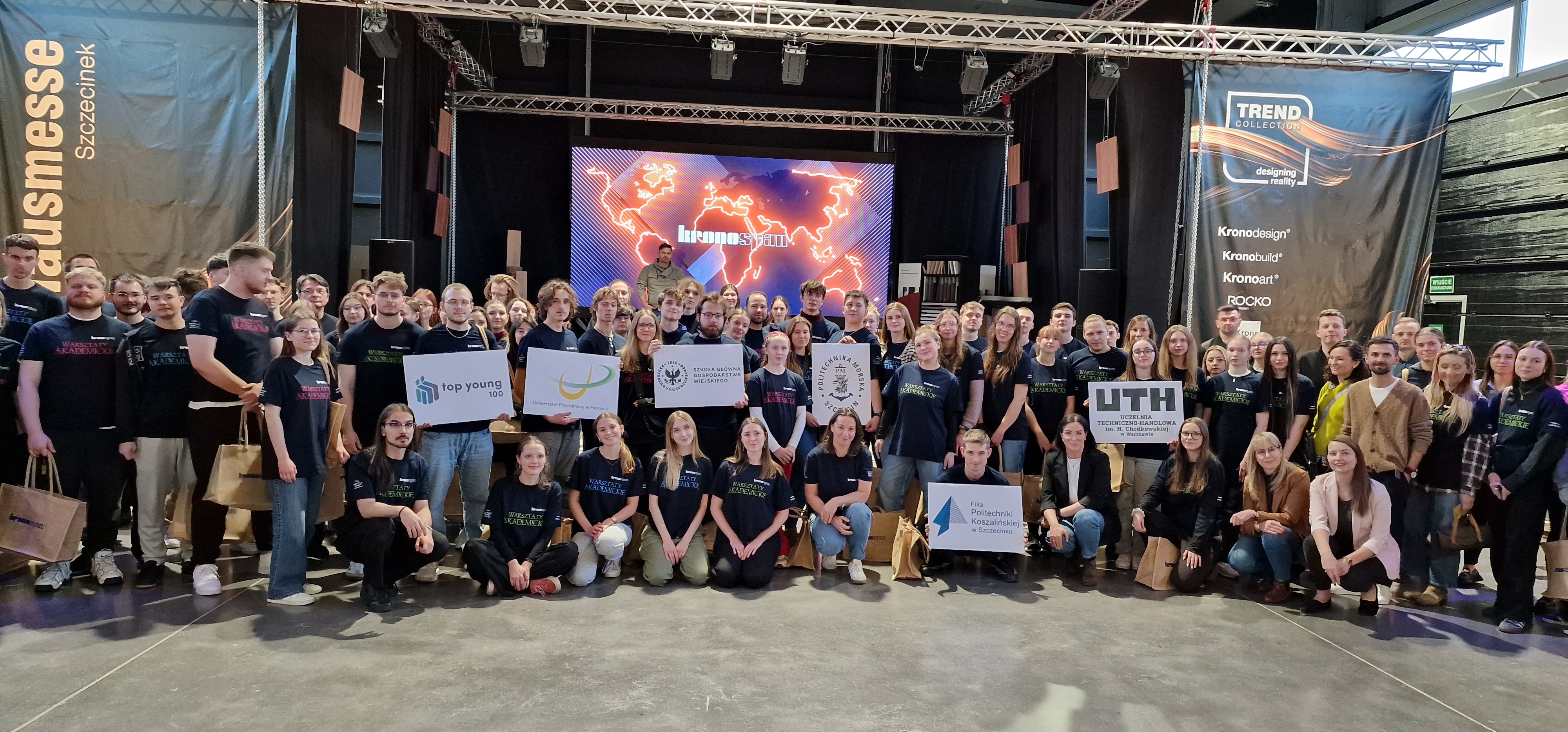 W budynku Krono Design Center w dniach 21 i 22 listopada odbyły się dwudniowe Warsztaty Akademickie, w których udział wzięli studenci SGGW w Warszawie, UTH w Warszawie, Uniwersytytu Przyrodniczego w Poznaniu, Politechniki Morskiej w Szczecinie i oczywiście studenci Filii PK w Szczecinku. Efektem prac studentów był zabudowany boks wraz z jedną ze ścian zewnętrznych z materiałów zakupionych przez studentów. Środki na zakupy, tzw. Kronosy, studenci zarabiali w piątek inwestując na minigiełdzie oraz w sobotę, wykonując przeróżne zadania (np. zespołowe Karaoke). Jesteśmy bardzo dumni, ponieważ zespół, w skład którego wchodzili nasi studenci - Magda Biernacka, Kuba Szuba, Bohdan Hladun i Kuba Daszkiewicz zdobył pierwsze miejsce. Zabawa była doskonała a za wzorową organizację dziękujemy firmie Kronospan.