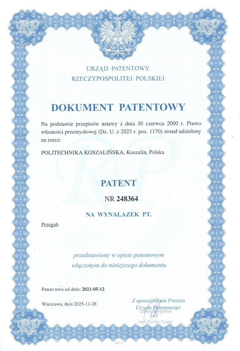 Zespół naukowców Politechniki Koszalińskiej w składzie: prof. dr hab. inż. Wojciech Kacalak; dr hab. inż. Zbigniew Szczepan Budniak; dr hab. inż. Maciej Jacek Majewski; dr inż. Grzegorz Piotr Chomka, opracował kolejny wynalazek, który uzyskał ochronę patentową Urzędu Patentowego Rzeczypospolitej Polskiej.