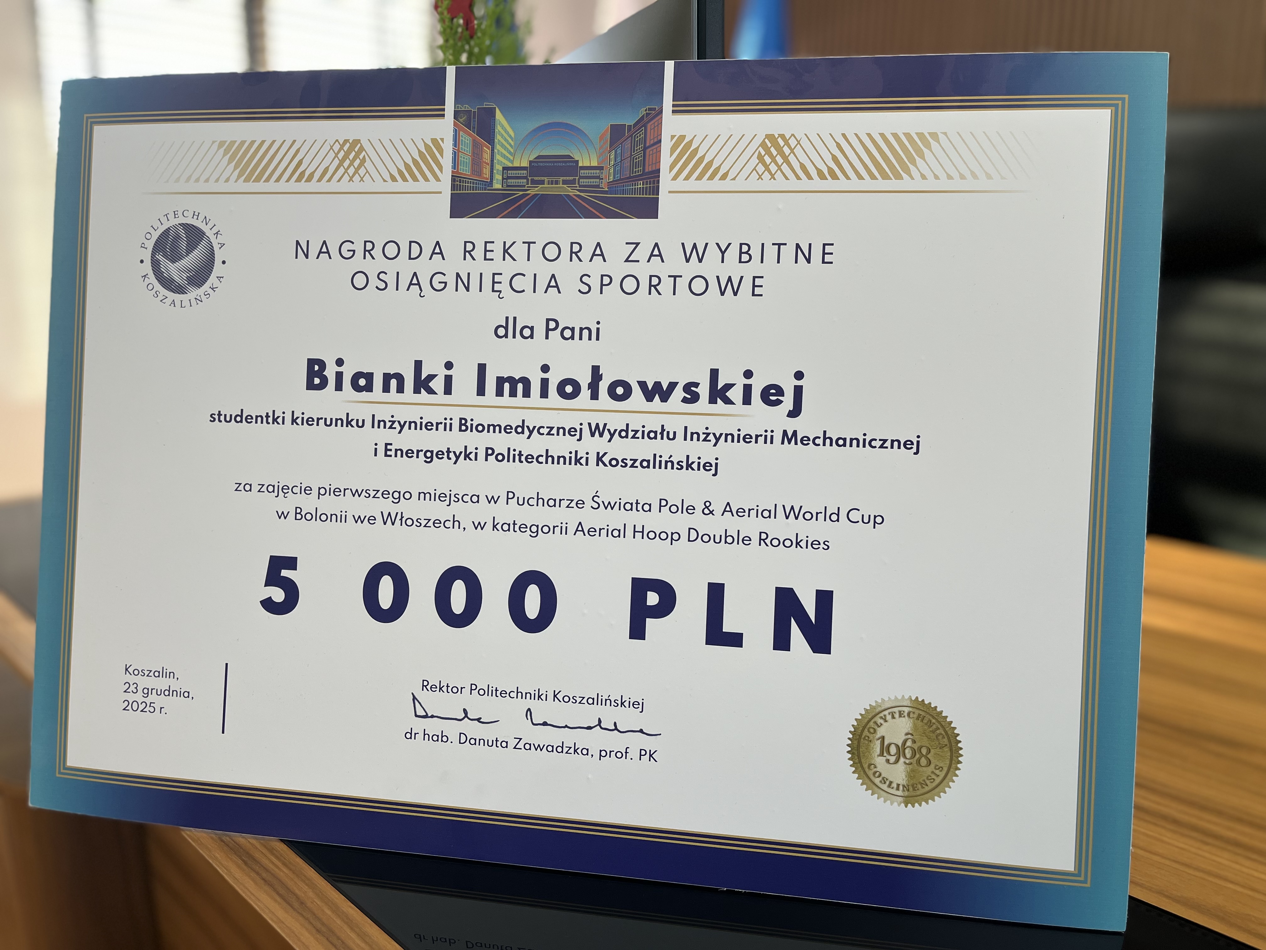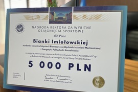 Bianka Imiołowska, studentka kierunku Inżynieria Biomedyczna na Wydziale Inżynierii Mechanicznej i Energetyki Politechniki Koszalińskiej, otrzymała dziś (23 grudnia br.) z rąk dr hab. Danuty Zawadzkiej, prof. PK, rektor Politechniki Koszalińskiej, nagrodę w wysokości 5 tys. zł za wybitne osiągnięcia sportowe.