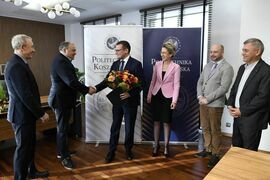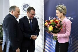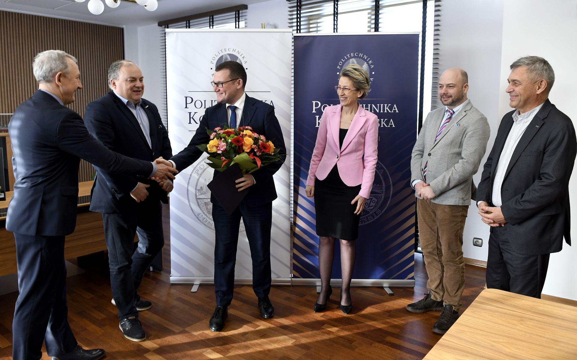 Z politykiem spotkała się rektor dr hab. Danutą Zawadzką, prof. PK. W rozmowach uczestniczyli również prorektorzy: dr hab. inż. Błażej Bałasz, prof. PK, dr hab. inż. Tomasz Królikowski, prof. PK i dr hab. Krzysztof Wasilewski, prof. PK oraz kanclerz uczelni Adam Gawrysiak. Prof. Danuta Zawadzka przekazała gościowi gratulacje z okazji objęcia funkcji w Pałacu Prezydenckim.