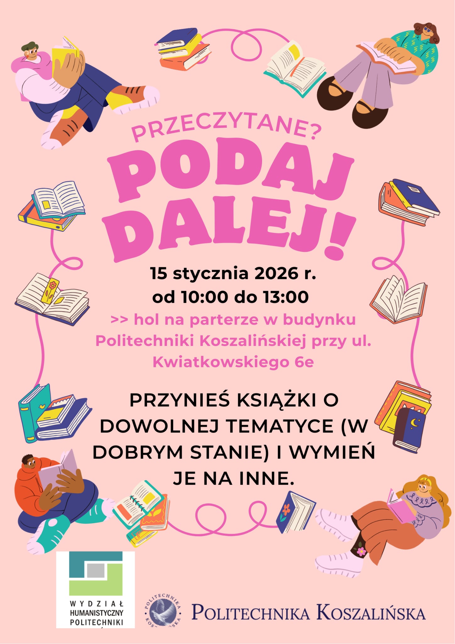 Już w najbliższy czwartek, 15 stycznia 2026 r., w holu budynku Politechniki Koszalińskiej przy ul. Kwiatkowskiego 6E odbędzie się akcja wymiany książek „Przeczytane? Podaj dalej!”. Wydarzenie organizują studenci III roku Dziennikarstwa i Komunikacji Społecznej Wydziału Humanistycznego PK.