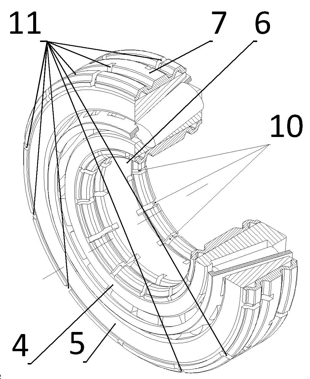 Wynalazek rozwiązał problem węzłów z bezluzowym osadzaniem łożysk z odkształcanymi pierścieniami o zróżnicowanej podatności i różnym współczynniku tłumienia drgań, które są osadzone suwliwie na wewnętrznych i zewnętrznych pierścieniach łożysk. Pierścienie sprężyste wewnętrzne i zewnętrzne dociskane przez wkrętki w kierunku osiowym odkształcają się we wszystkich kierunkach, powodując kasowanie luzów promieniowych w węzłach łożyskowych.
