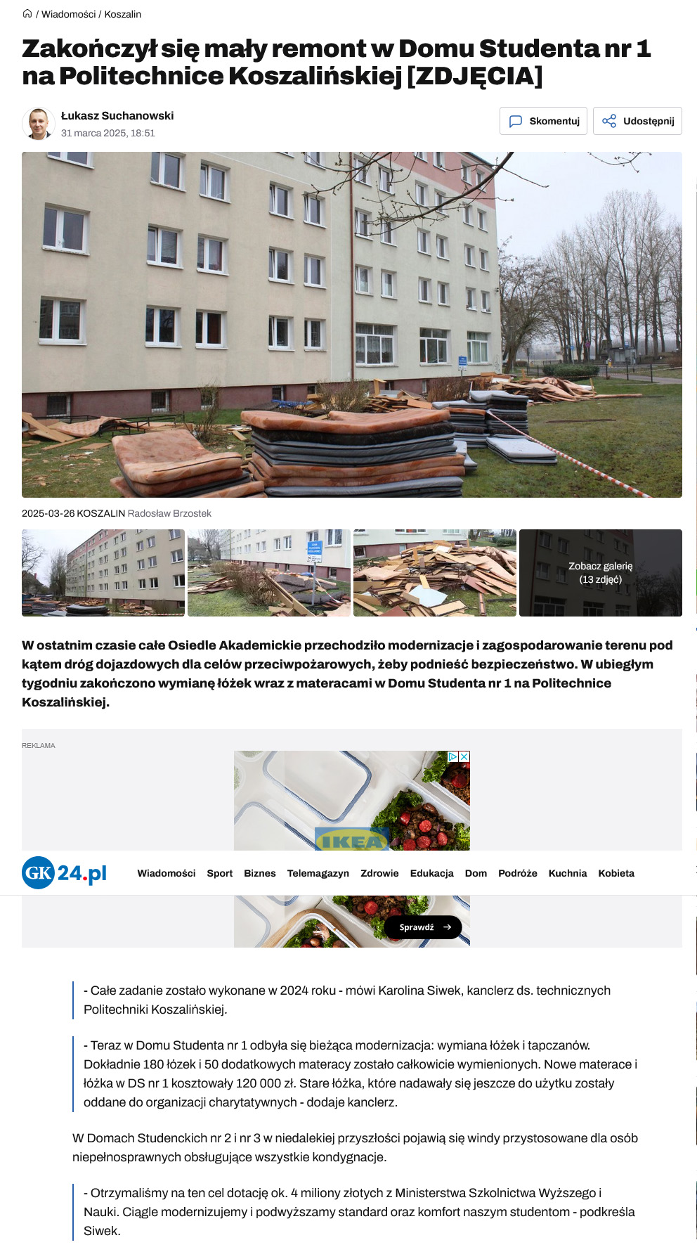 Zakończył się mały remont w Domu Studenta nr 1 na Politechnice Koszalińskiej