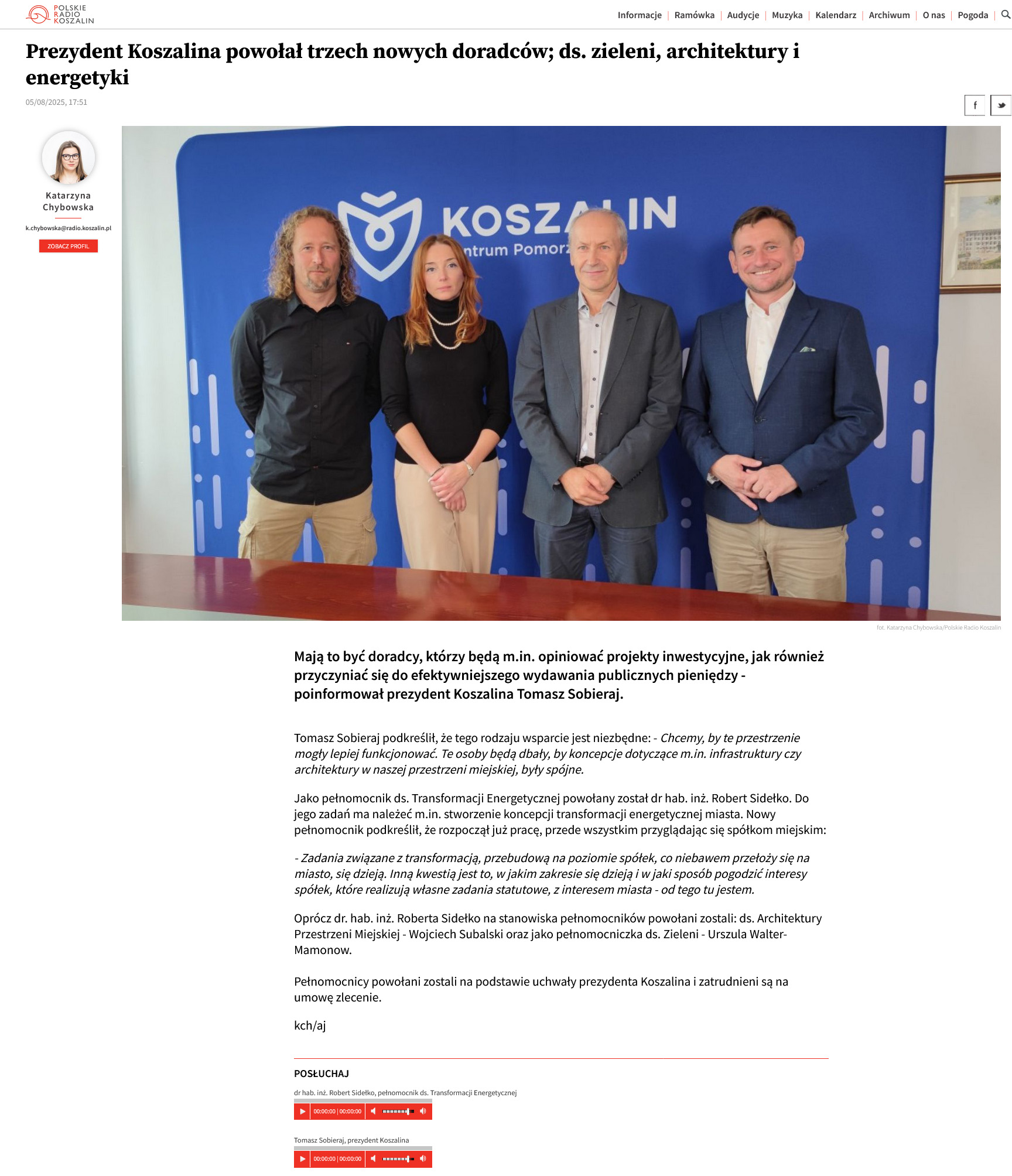 Prezydent Koszalina powołał trzech nowych doradców; ds. zieleni, architektóry i energetyki