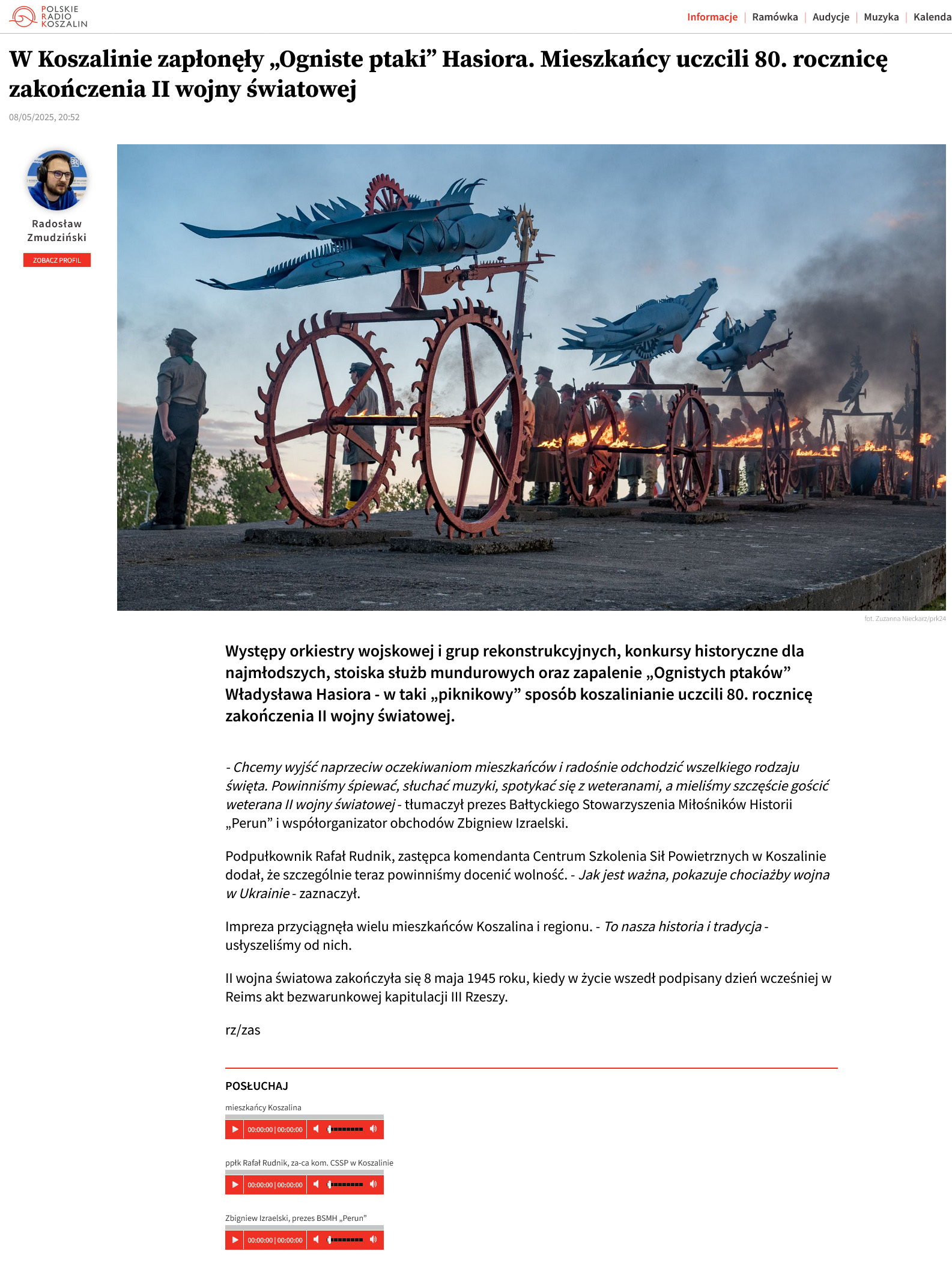 W Koszalinie zapłonęły "Ogniste ptaki" Hasiora. Mieszkańcy uczcili 80. rocznicę zakończenia II wojny światowej