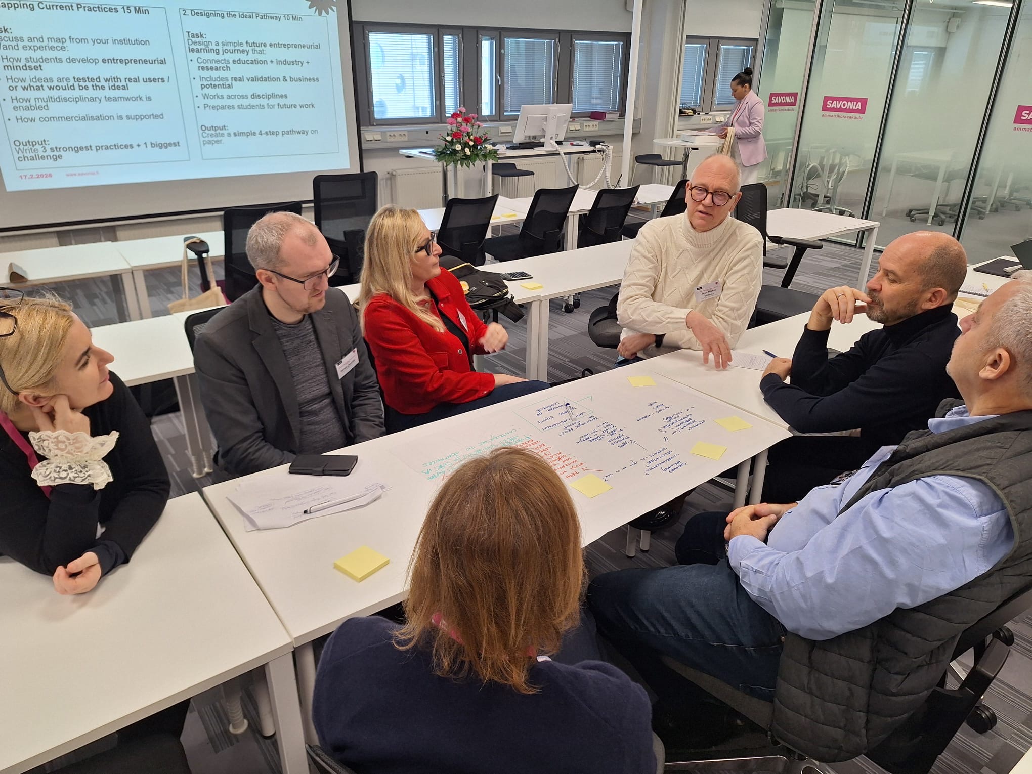 Wczoraj (17 lutego br.,) odbył się warsztat „Entrepreneurial Education and Commercialisation in Multidisciplinary Teams”, prowadzony przez specjalistę RDI Mattiego Laitinena. Spotkanie koncentrowało się na wzmacnianiu kompetencji przedsiębiorczych studentów oraz budowaniu ścieżki od pomysłu do wdrożenia rynkowego. Uczestnicy poznali praktyczne modele współpracy studentów z ekspertami i partnerami biznesowymi, a także narzędzia wspierające proces komercjalizacji innowacyjnych rozwiązań.Dużym zainteresowaniem cieszyły się również warsztaty poświęcone edukacji zdrowotnej, podczas których zaprezentowano wykorzystanie narzędzi cyfrowych w procesie praktyk klinicznych, elementy grywalizacji w dydaktyce oraz funkcjonowanie multidyscyplinarnej kliniki dydaktycznej OSKE w regionie North Savo. Przedstawione rozwiązania pokazują, jak skutecznie łączyć kształcenie, badania i realne usługi społeczne. Równolegle odbywały się zajęcia dotyczące kształtowania kompetencji przyszłości w edukacji biznesowej, podczas których uczestnicy – w formule warsztatowej – współtworzyli koncepcje nowych modułów kształcenia odpowiadających na potrzeby rynku pracy.