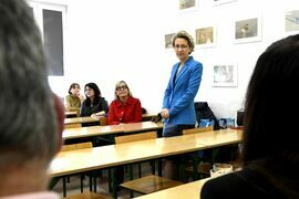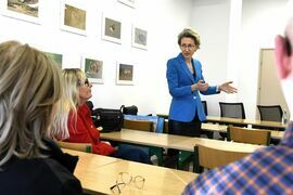 Rektor podziękowała pracownikom SJO za skuteczną rekrutację, która mimo niżu demograficznego nie odniosła w ostatnich latach spadków. Podziękowania dotarły do zgromadzonych także za metodykę, sumienność i zaangażowanie. Rektor Danuta Zawadzka podziękowała w imieniu dr hab. Krzysztofa Wasilewskiego za realizację programu w ramach sojuszu EU4Dual.