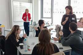 Zajęcia prowadzone są w formule warsztatowej. Wczoraj, (25 marca br.) mgr Małgorzata Merkis i mgr Joanna Stankiewicz-Majkowska poprowadziły blok zajęć Multicultural Communication – Case Studies. Równolegle mgr Marzena Hus uczestniczyła w spotkaniach roboczych wspólnie z Juttą Helmus w LehrLernZentrum RheinMain UAS oraz z kierowniczką centrum Louise Klein, co dodatkowo wzmacnia współpracę instytucjonalną i wymianę praktyk dydaktycznych.