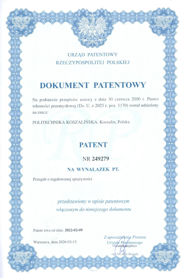 Zespół naukowców w składzie: prof. dr hab. inż. Wojciech Kacalak; dr hab. inż.; Zbigniew Budniak, prof. PK; dr inż. Monika Szada-Borzyszkowska, opatentował wynalazek pn. "Przegub o regulowanej sprężystości".