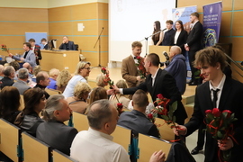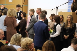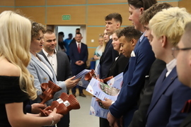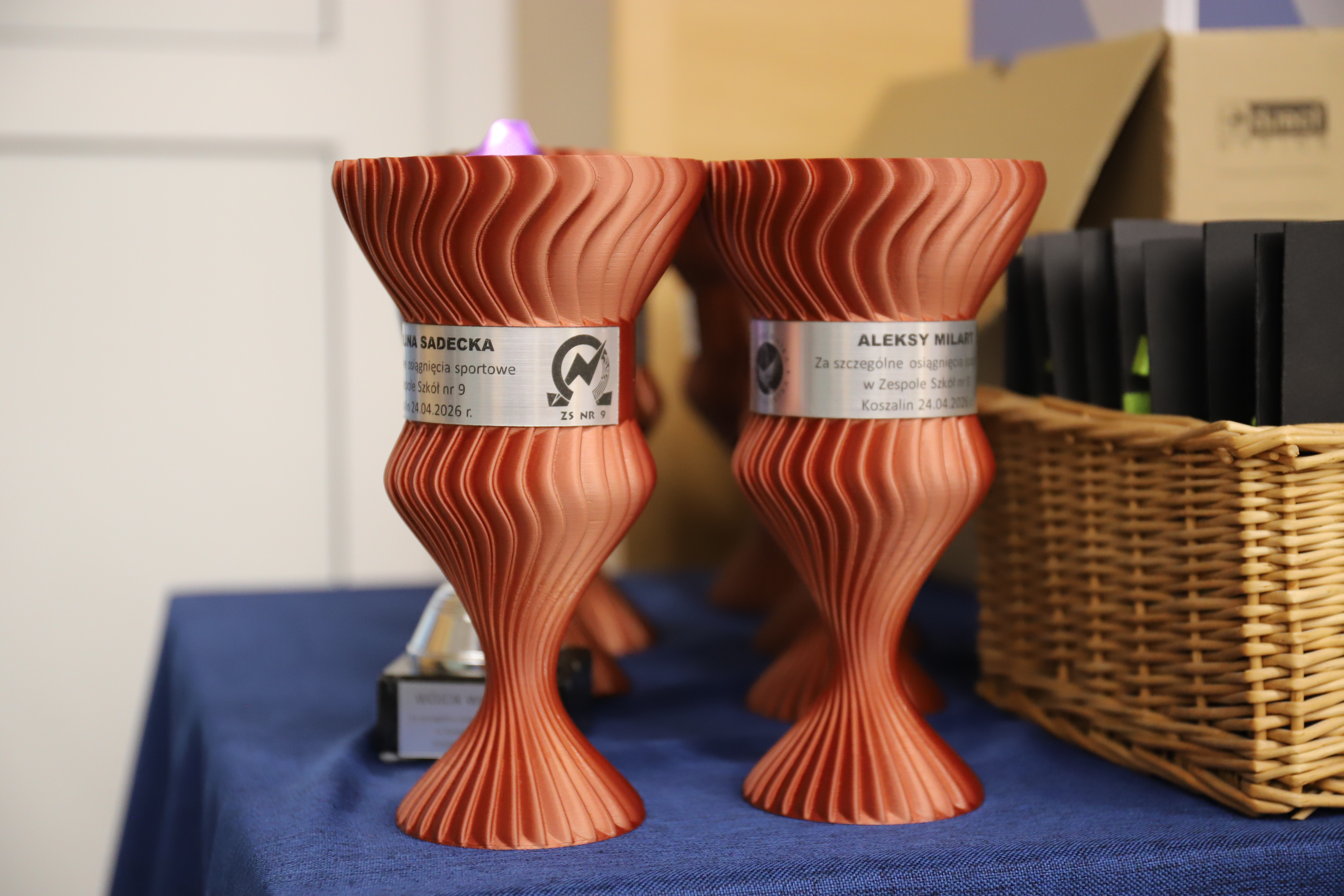 Szczególnym momentem akademii było wręczenie wyróżnień dla uczniów, którzy osiągnęli wysokie wyniki w nauce, aktywnie reprezentowali szkołę w konkursach i olimpiadach oraz angażowali się w życie społeczności szkolnej. Doceniono również sportowców, którzy z sukcesami reprezentowali Zespół Szkół nr 9 podczas zawodów i turniejów na różnych szczeblach rywalizacji. Warto dodać, że puchary dla sportowców zostały wydrukowane przez Centrum Druku 3D Politechniki Koszalińskiej.
