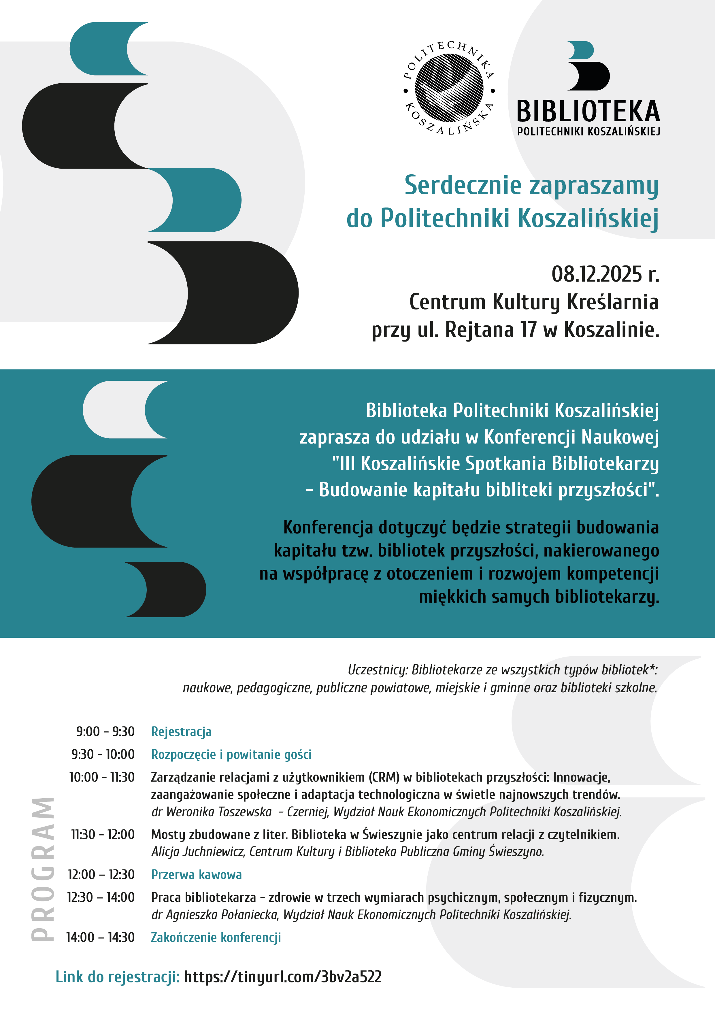 Biblioteka Politechniki Koszalińskiej ma zaszczyt zaprosić Państwa do udziału w Konferencji Naukowej „III Koszalińskie Spotkania Bibliotekarzy - Budowanie kapitału biblioteki przyszłości”. Spotkanie odbędzie się dnia 8 grudnia 2025 r. o godzinie 9:00 w Centrum Kultury Studenckiej Kreślarnia Politechniki Koszalińskiej przy ul. Rejtana 17 w Koszalinie.