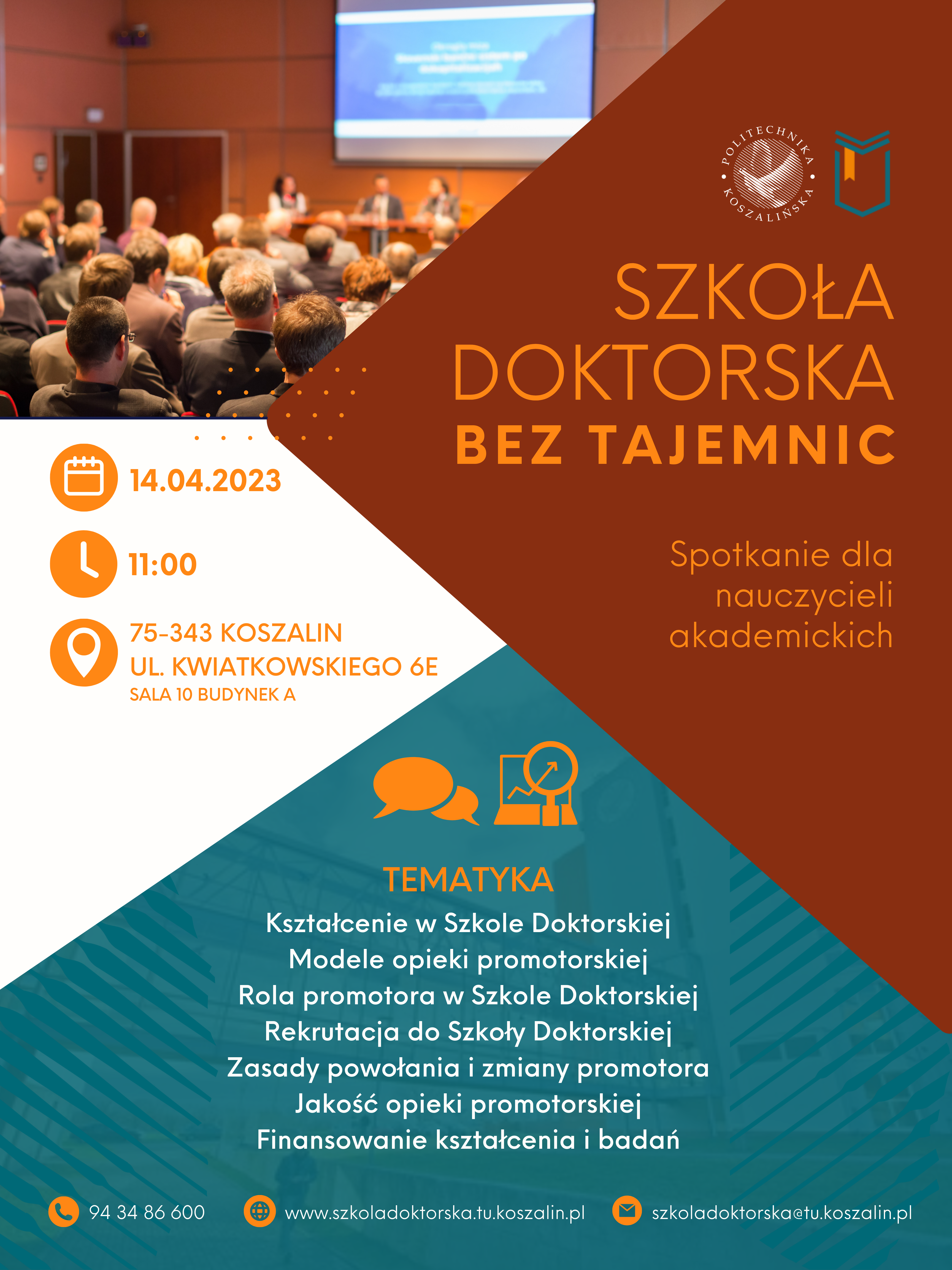 Zapraszamy na spotkanie dla nauczycieli akademickich zainteresowanych pełnieniem funkcji promotora w Szkole Doktorskiej Politechniki Koszalińskiej. Na spotkaniu zostaną poruszone następujące zagadnienia: